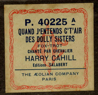 P. 40225 A Quand j'entends c't'air des Dolly Sisters Fox-Trot Chanté par Chevalier Harry Cahill Editions Salabert The Aeolian Company Paris |