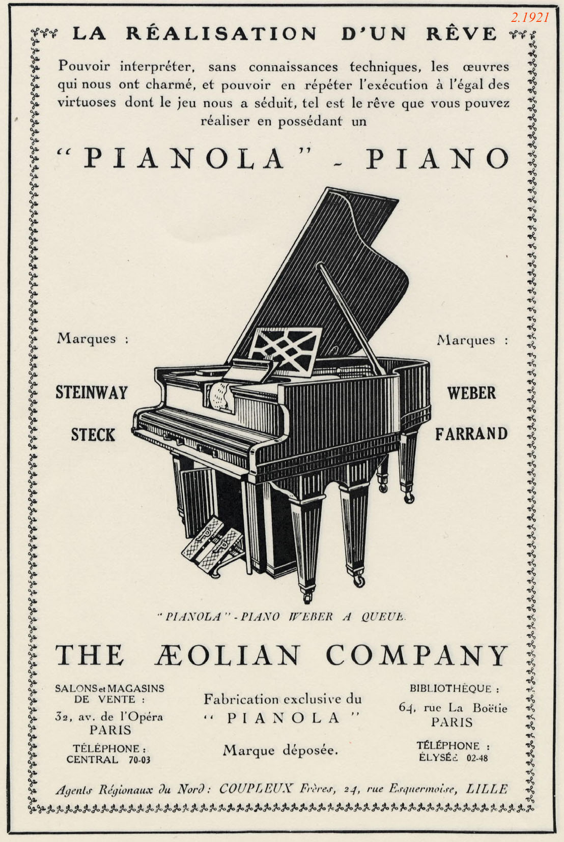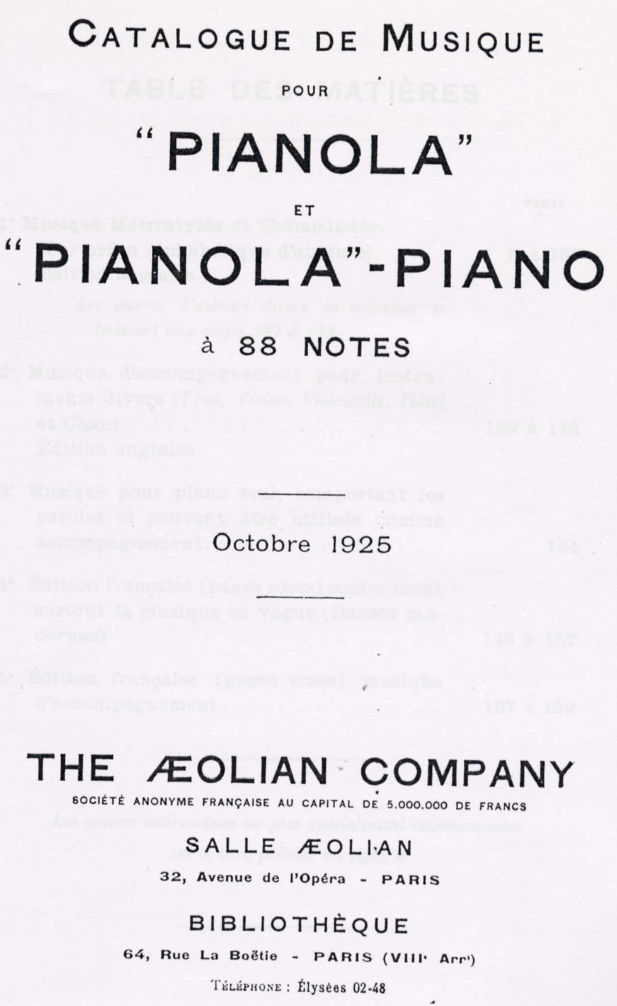 As early as 1921, there appears in advertisements an address for the Aeolian library at 64 rue La Boëtie (AeoFr_32_64.jpg), and these addresses appear also in the Aeolian roll catalog of 1925.