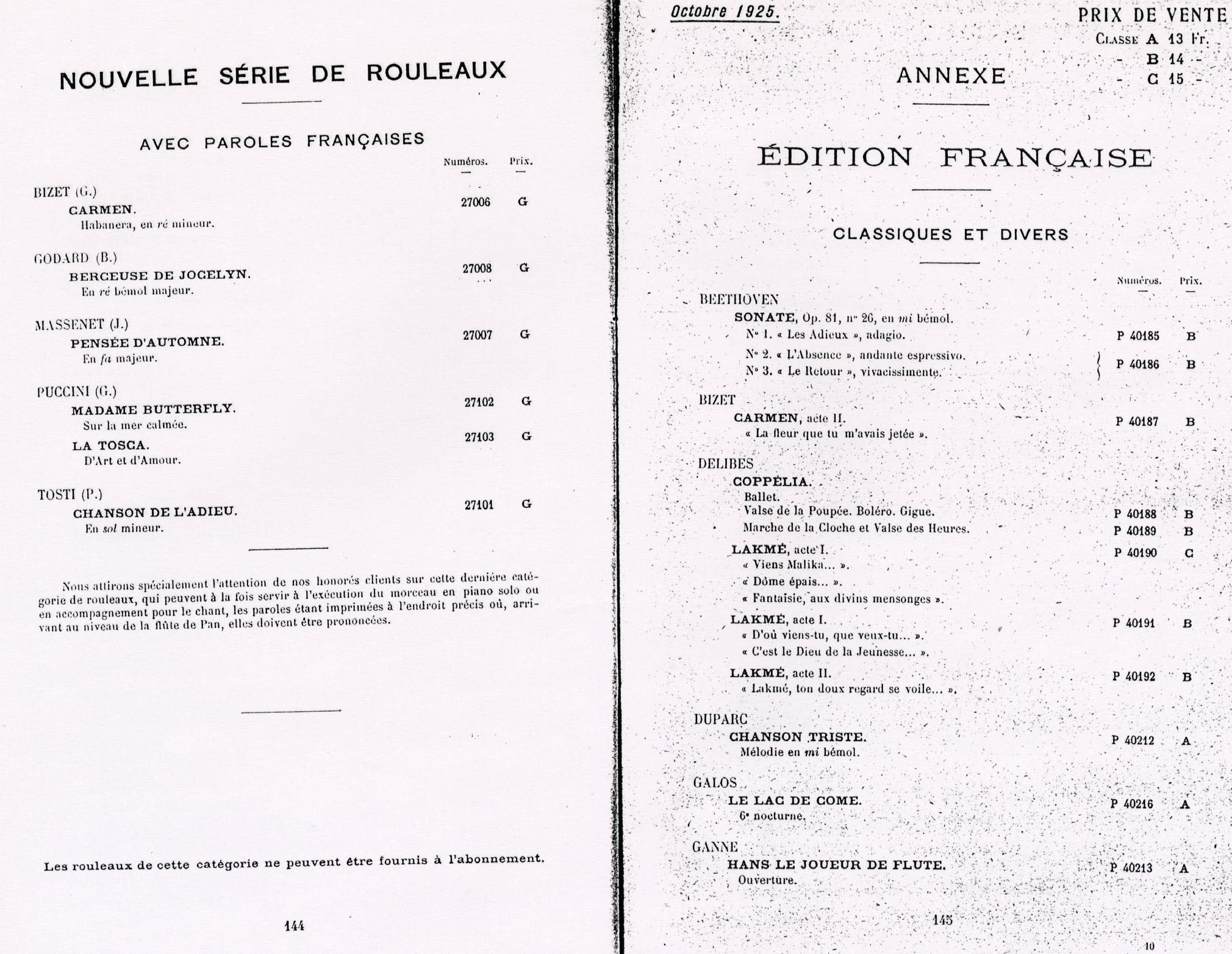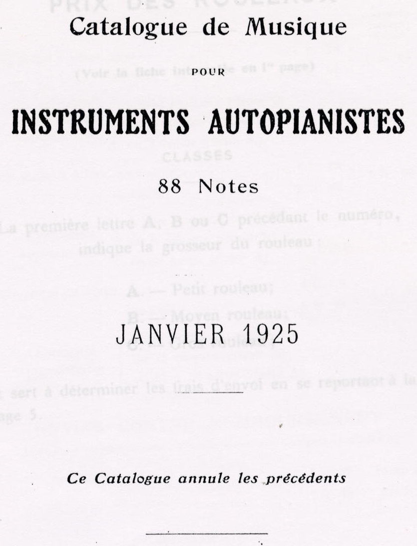 As I mentioned in a previous email, the two rolls of Ravel, RA 1792 X and RA 1796 X, are from L'EMP. They are listed on page 143 of the "Catalogue de Musique pour Instruments Autopianistes 88 notes" of January 1925. See the 3 JPEG files (EMP catalog, cover, introduction) and 2 pages with Ravel rolls.