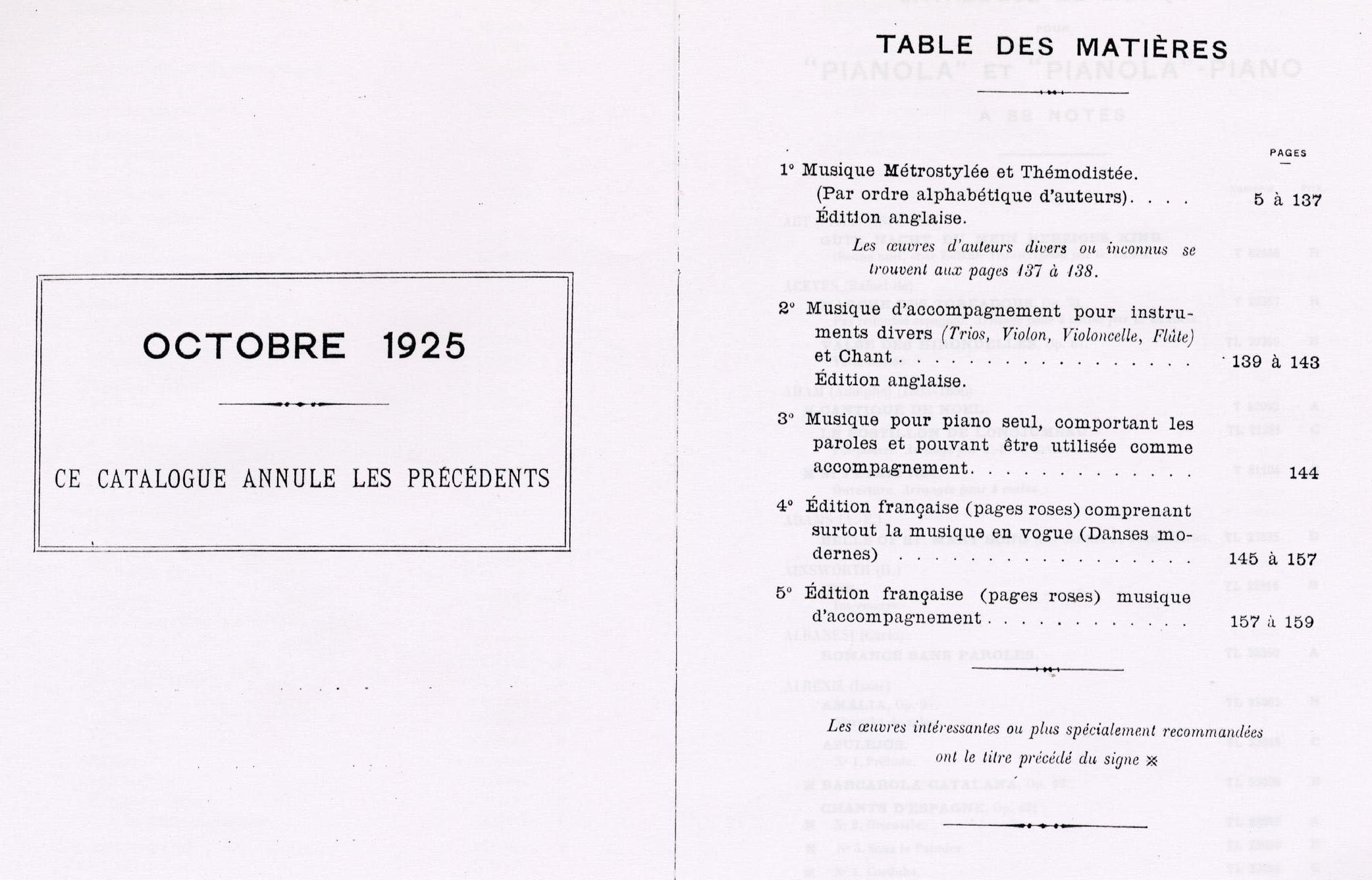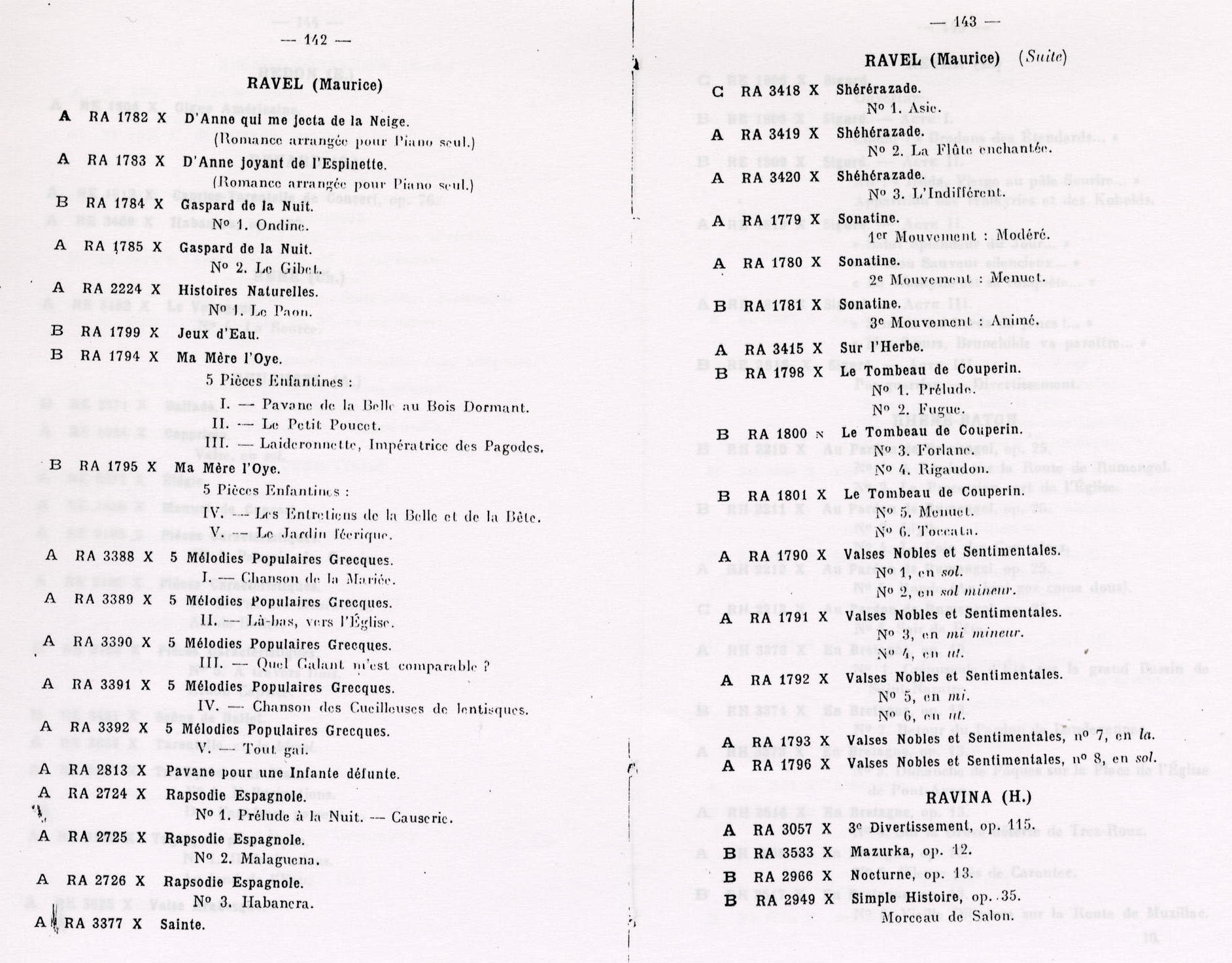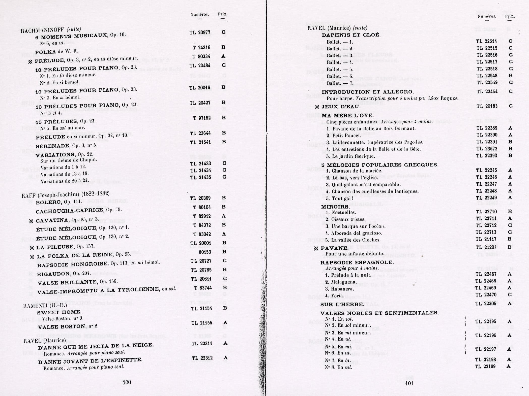 The content is important: in the table of contents we discover in the first and second points that music listed is "Edition anglaise" (English edition), and points 4 and 5 are French editions printed on pink pages (pages roses) in the catalog. It is concerned especially with dance music and piano part music. No need to insist on the Ravel music pages, whose references are the same as the English originals but with French text.