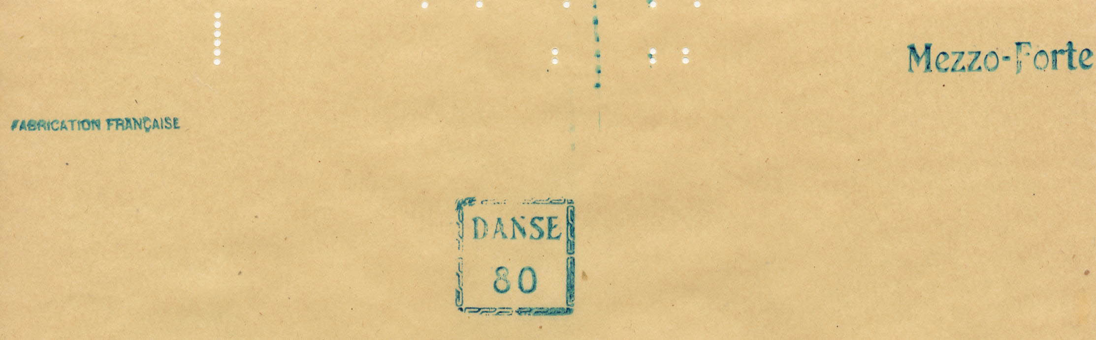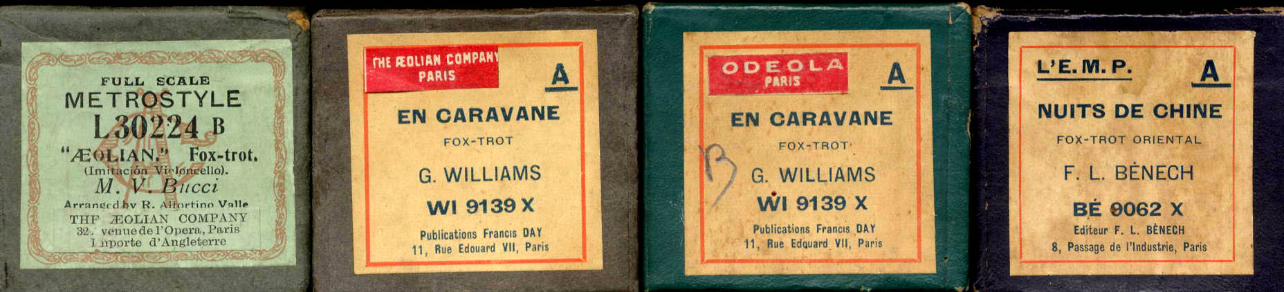At the far left side is an Aeolian roll ("Aeolian", Fox-trot) sold in France from a French dealer. Such Aeolian rolls are very common here and are UK production. The only difference is an added small green sticker at the bottom covering the UK address, with the name The Aeolian Company and the address 32 avenue de l'Opéra, Paris, and the mention "Importé d'Angleterre", meaning imported from England. Inside, the roll is an original UK product and any markings are in English.