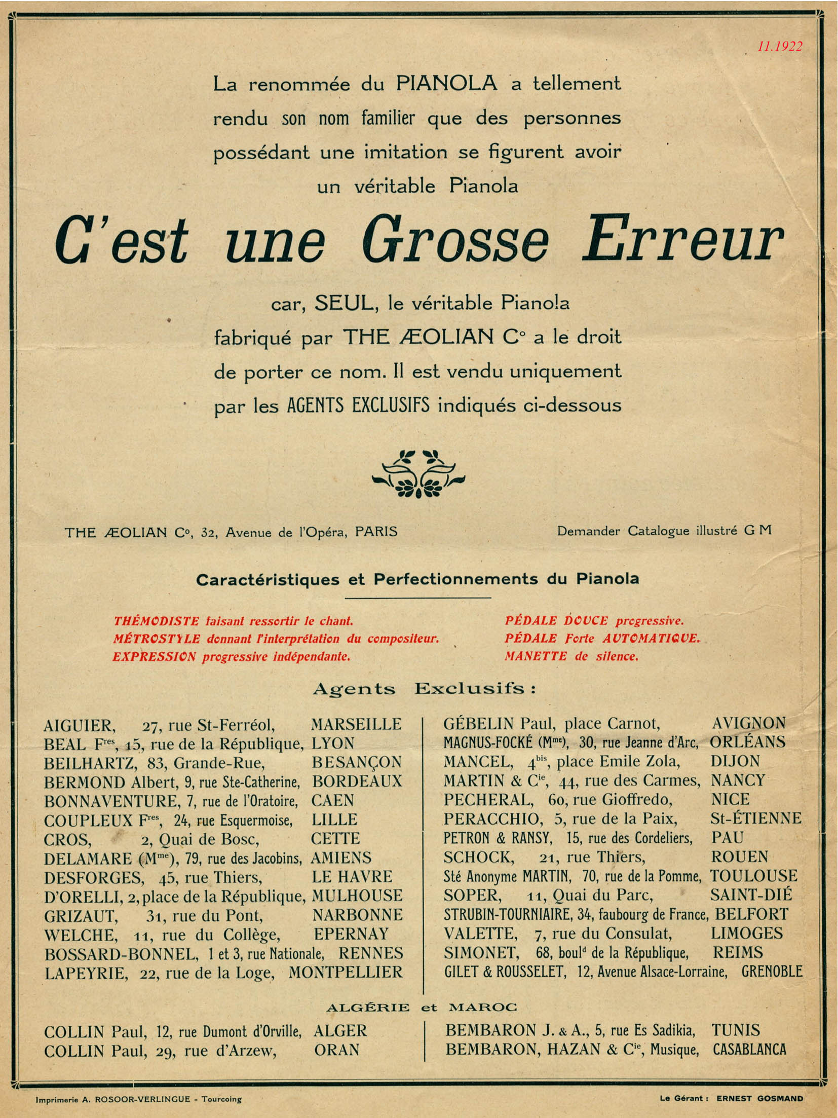 No. French retailers did that for him, and he was given an Aeolian catalog in French to choose from among hundreds of rolls he could listen to at his local retailer in big towns in France (see "aeolian vendeurs" image), or in Paris, at the Aeolian hall, where concerts were also given (as Aeolian did in other capitals in Europe, and as did other firms like Pleyel in Paris).