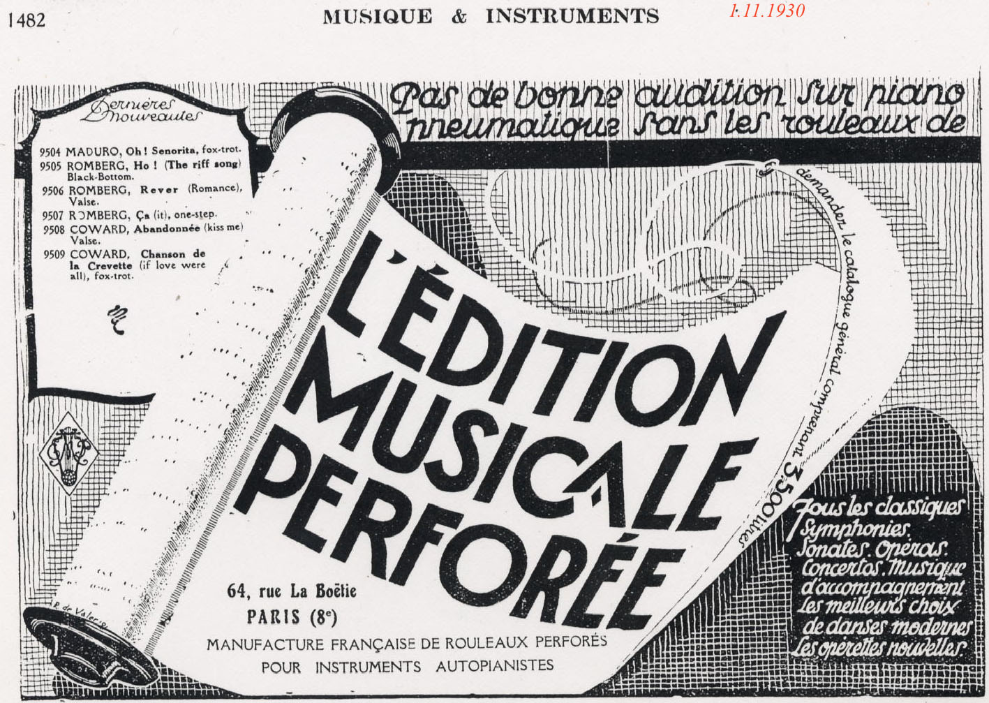 Later in November 1930 the address for L'EMP is the Aeolian library address, 64 rue de la Boëtie, and codification has changed to the usual Aeolian system. We know that Aeolian has purchased music from Pleyel when their player piano activity was falling. Is it the same situation here? Or is there another explanation due to commercial links between the two firms?