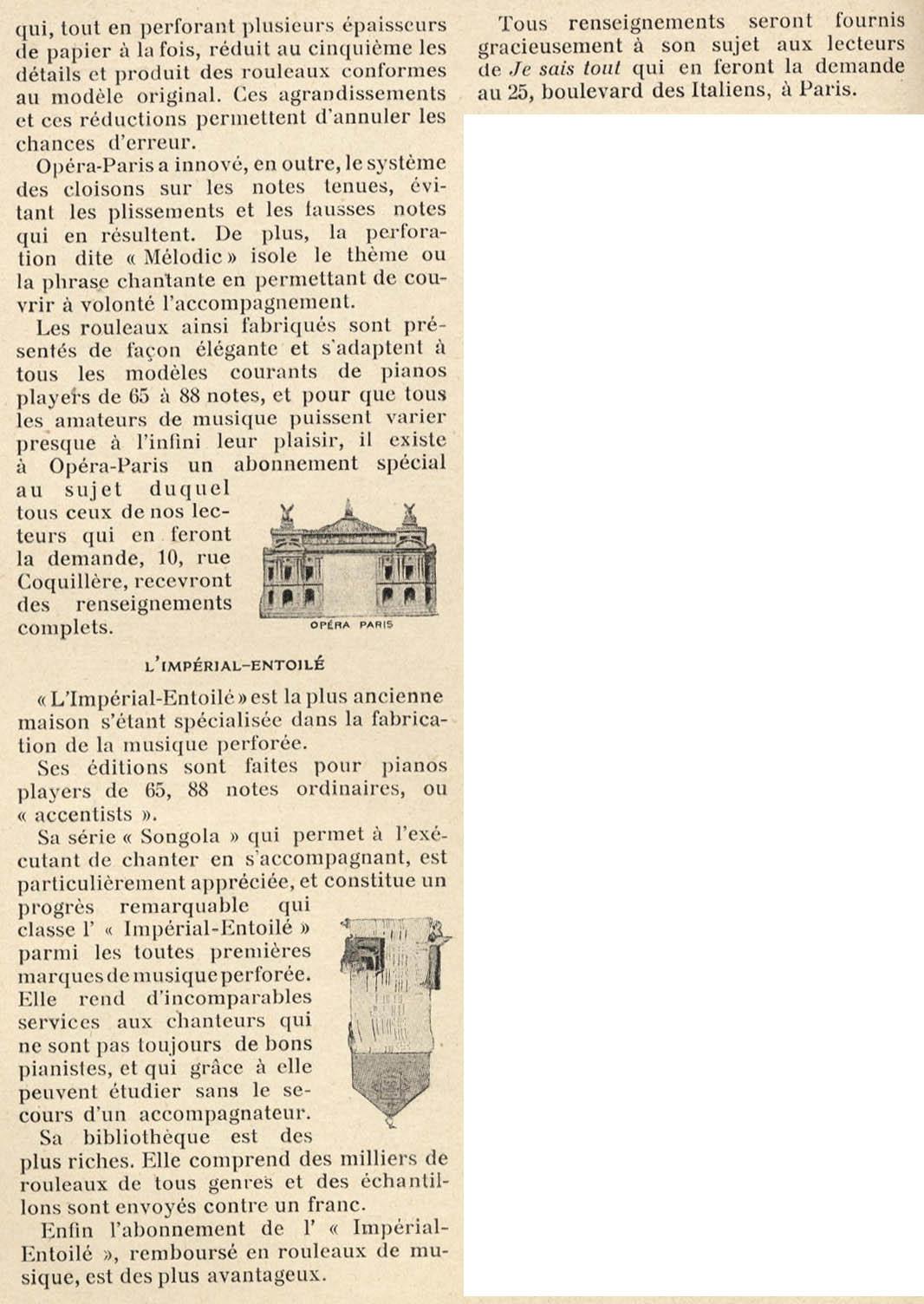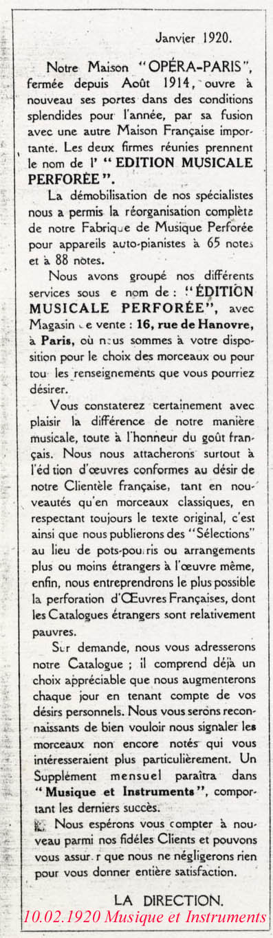 The commercial history of l'Edition Musicale Perforée begins in January 1920 but the true origin takes place many years before with the creation of Opera-Paris.