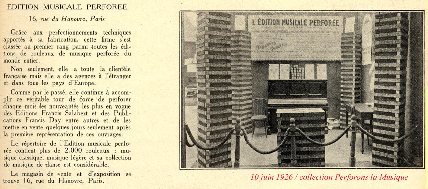 From 1921 on, l'EMP is very aggressive. They are the only French piano roll firm to be present at every Paris Fair, first at the Odeola stand in 1921, and later with their own stand like the one you can see in this 1926 report with the four impressive roll towers. At this time, they sell also rolls for the publishers Salabert and Françis Day.