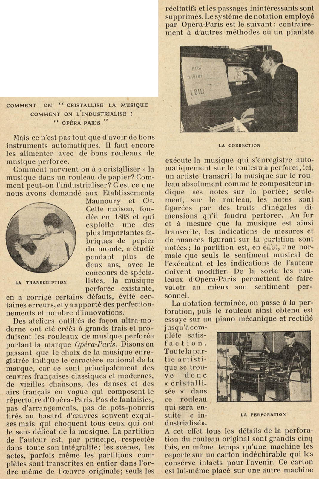 In the 1913 newspaper "Je Sais Tout" ["I know all"!] we have the chance to visit the Opera-Paris factory, showing us the transcription, checking and punching operations. (Another interesting and more detailed article will be written later, illustrated with larger pictures, that was reprinted in 1995 in our society journal, "Les Cahiers de Perforons").