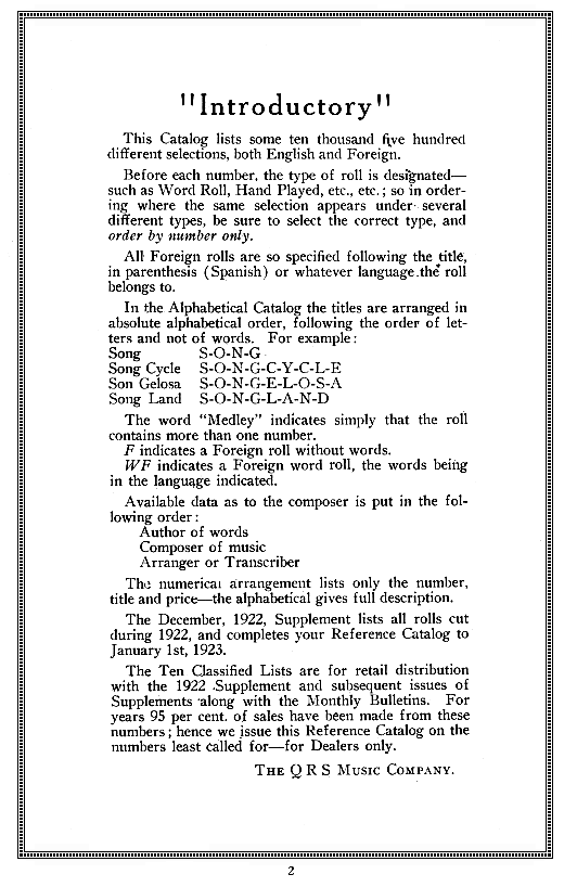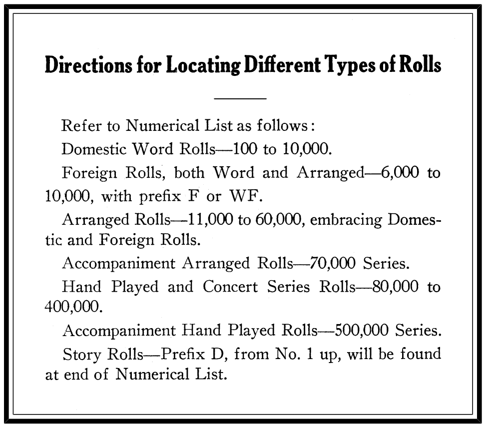 2. Introduction 3. Pictures of Factories 4. Directions for Locating Different Types of Rolls 5. Domestic Word Rolls, alphabetical 250. Numerical Arrangement, 100 to 1972 257. Foreign Rolls, F6000 to F6965 262. Arranged Rolls, 11001 to 12933 269. Arranged Rolls, 20001 to 21127 271. Arranged Rolls, 30001 to 33384 277. Arranged Rolls, 40009 to 42224 279. Arranged Rolls, 50001 to 50119 279. Arranged Rolls, 60001 to 60587 281. Accompaniment Arranged Rolls, 70001 to 70405 284. Hand Played and Concert Series Rolls, 80001 to 81032 288. Hand Played and Concert Series Rolls, 90000 to 90203 289. Hand Played and Concert Series Rolls, 100002 to 101014 290. Hand Played and Concert Series Rolls, 200002 to 200505 291. Hand Played and Concert Series Rolls, 300001 to 300004 291. Hand Played and Concert Series Rolls, 400001 to 400175 291. Accompaniment Hand Played Rolls, 500000 to 500128 292. Story Rolls, D1 to D80 |