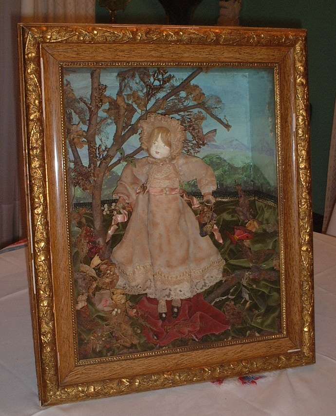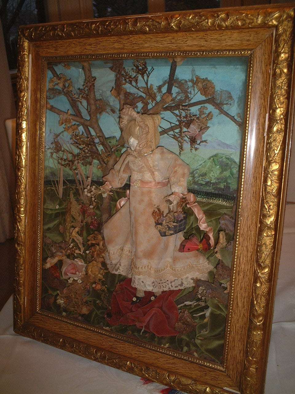 It is a "Flower Girl" framed like a picture, the frame is about 70 by 45 cm [27.5 x 18 inches]. On the front glass are printed golden letters (not very easy to read) that show: