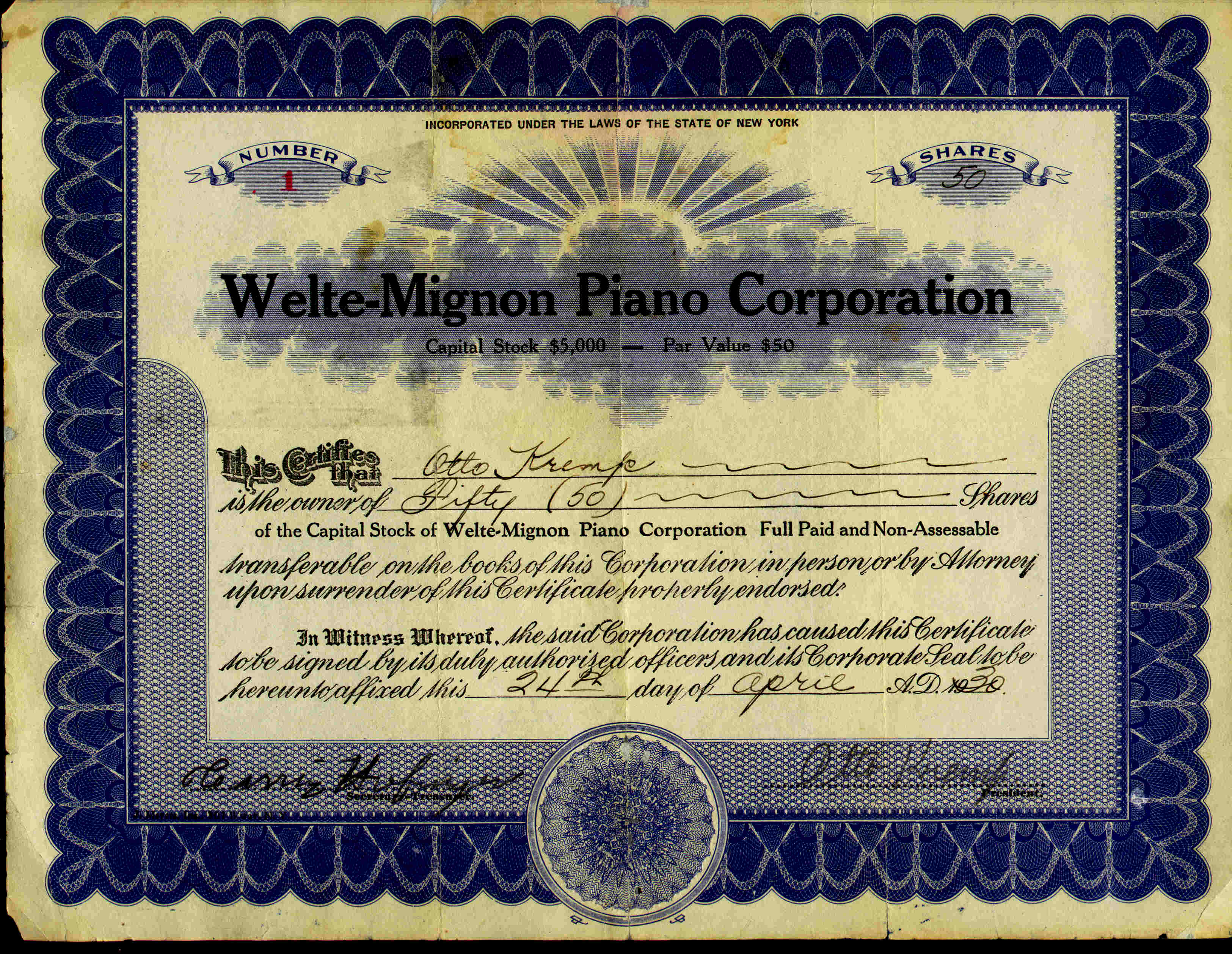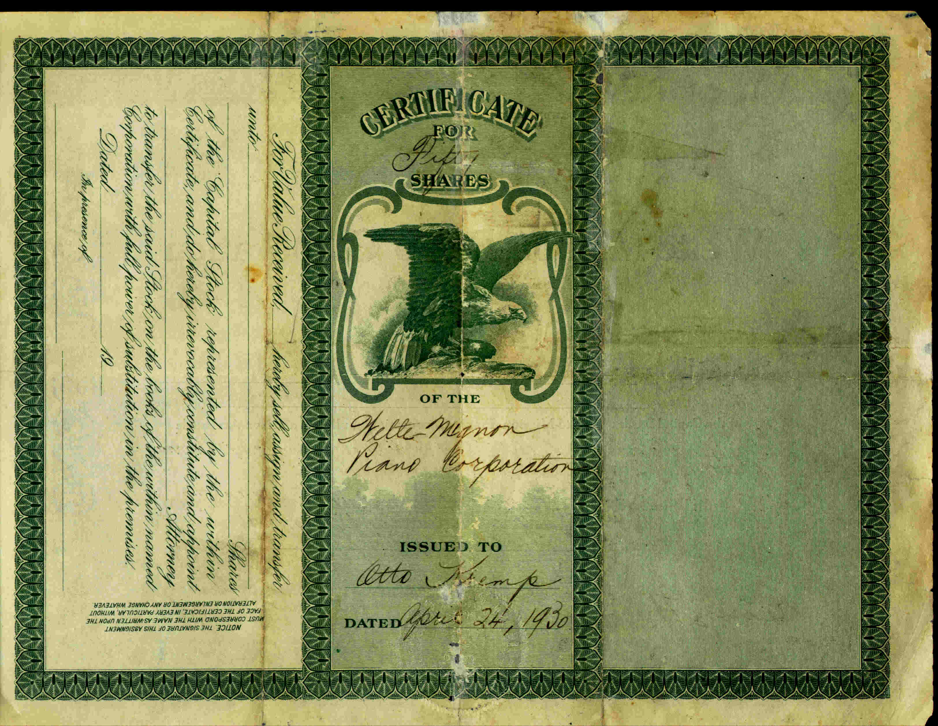 Stock certificate issued 24 April 1930, bearing the signature of Otto Kremp, President.