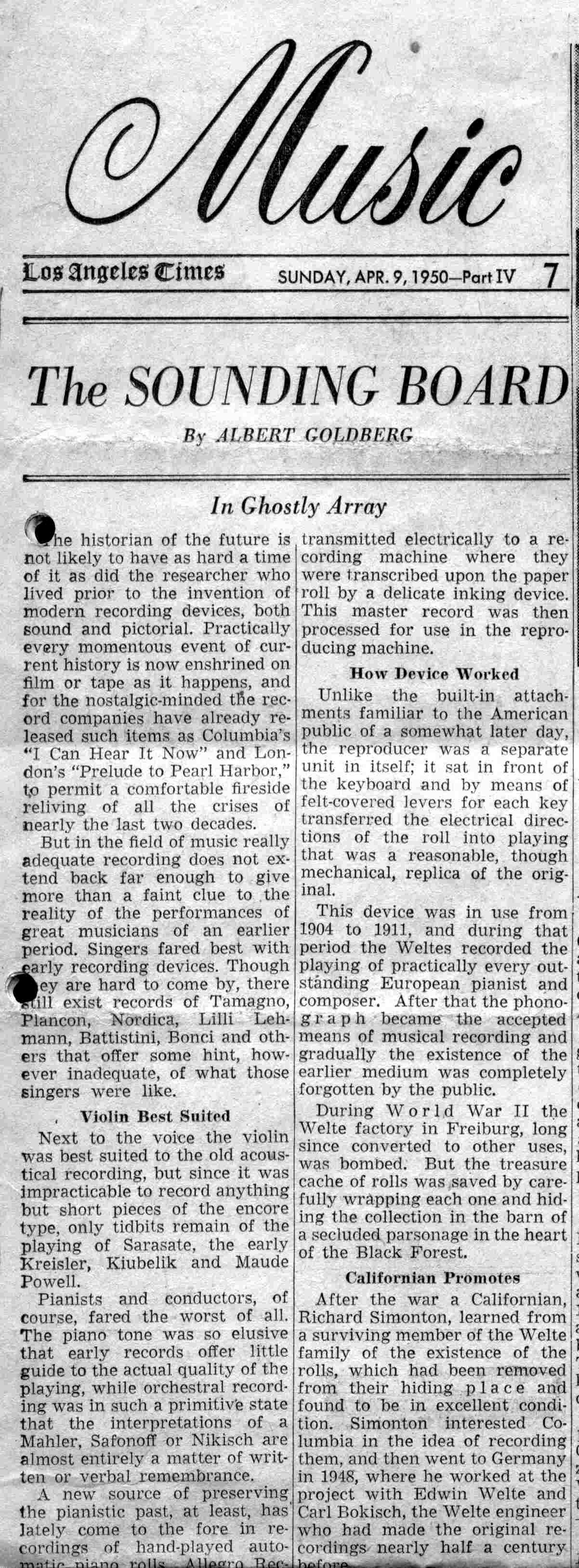 After the war a Californian, Richard Simonton, learned from a surviving member of the Welte family of the existence of the rolls, which had been removed from their hiding place and found to be in excellent condition. Simonton interested Columbia in the idea of recording them, and then went to Germany in 1948, where he worked at the project with Edwin Welte and Carl Bockisch, the Welte engineer who had made the original recordings nearly half a century before. The rolls were played on the one remaining Welte player[4] for which they had been made and re-recorded on tape under extremely difficult conditions. It is this contribution to history which Columbia now releases on the five LP disks of the "Great Masters of the Keyboard" series. In some instances the playing has the dead quality characteristic