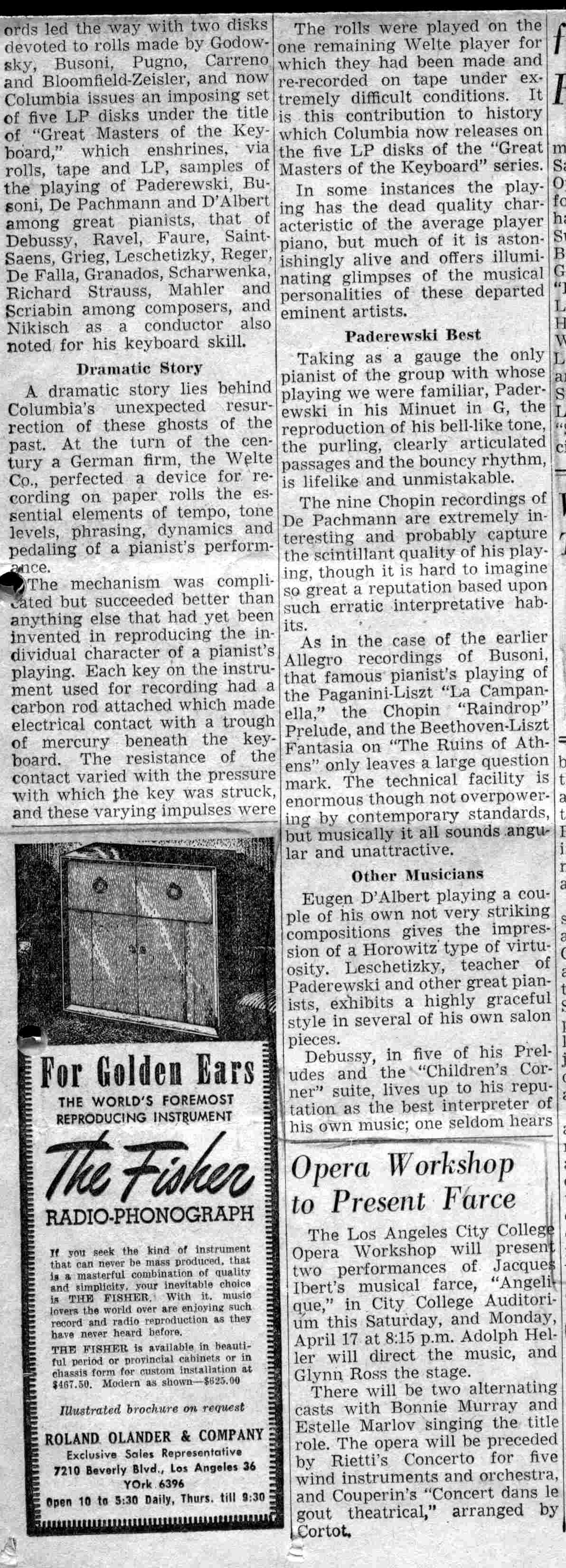 A dramatic story lies behind Columbia's unexpected resurrection of these ghosts of the past. At the turn of the century a German firm, the Welte Co., perfected a device for recording on paper rolls the essential elements of tempo, tone levels, phrasing, dynamics and pedaling of a pianist's performance. The mechanism was complicated but succeeded better than anything