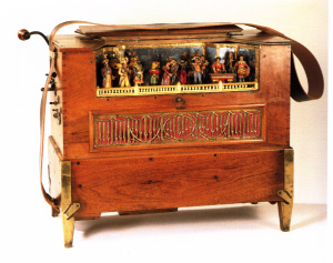 Date: Simonswald, 23 December 1829 Pinned wooden cylinder 10 melodies 23 keys, 107 pipes in 5 registers 66 x 34 x 55 centimeters Present Location: Schloss Bruchsal museum |