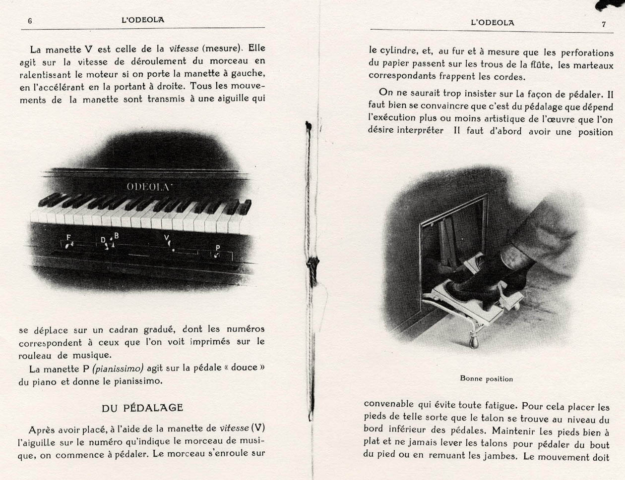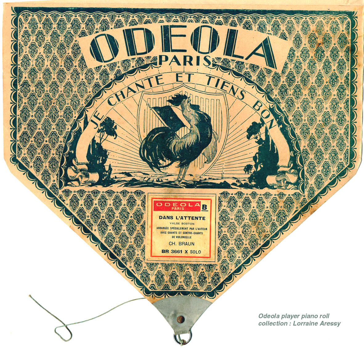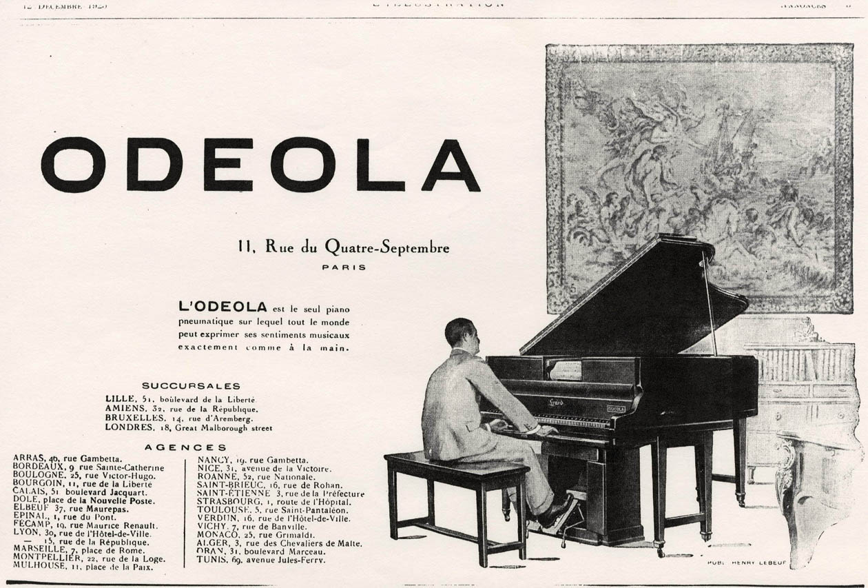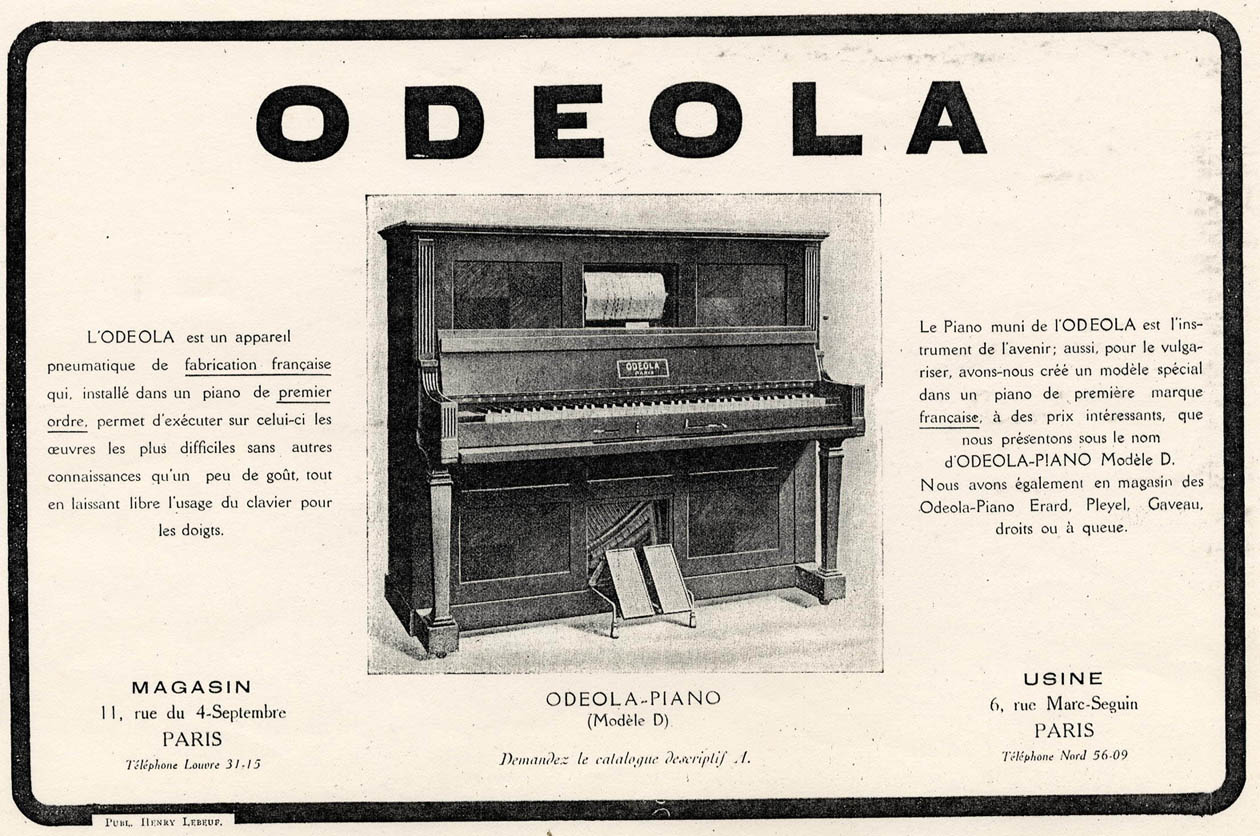 The 88-note player mechanisms equipped either Odeola pianos or great French makes, such as Erard, Pleyel and Gaveau, which were well-appreciated by the middle class folk of the time.  The commercial shop was in Paris, at 11, Rue de Quatre-Septembre, and the factory was at 6, rue Marc Seguin.  About 30 agencies were to be found in important cites (Lyon, Bordeaux, Nice, Monaco...), also in African colonies at Alger, Oran or Tunis.  Branches were in Bruxelles and London.