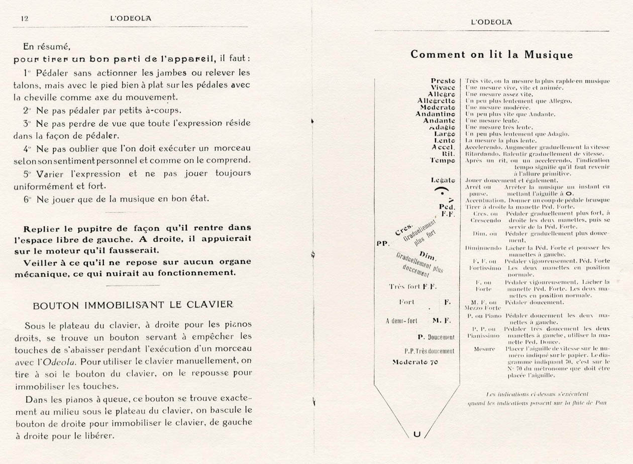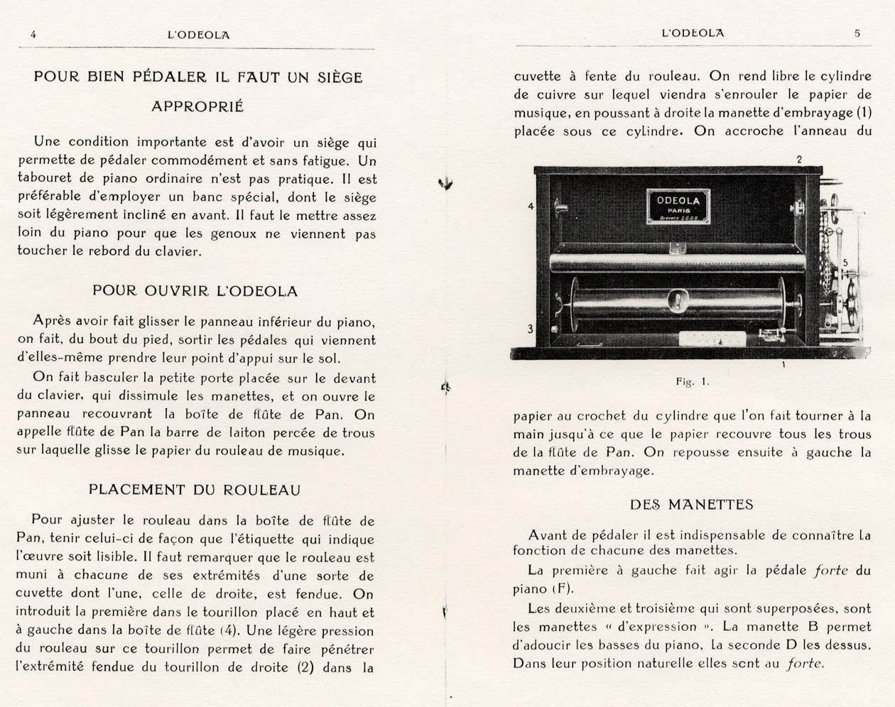 The ODEOLA is a pneumatic device of French manufacture, installed in a first-class piano, which enables performance of the most difficult works with no other knowledge than a little taste, while leaving the keyboard free to use the fingers.