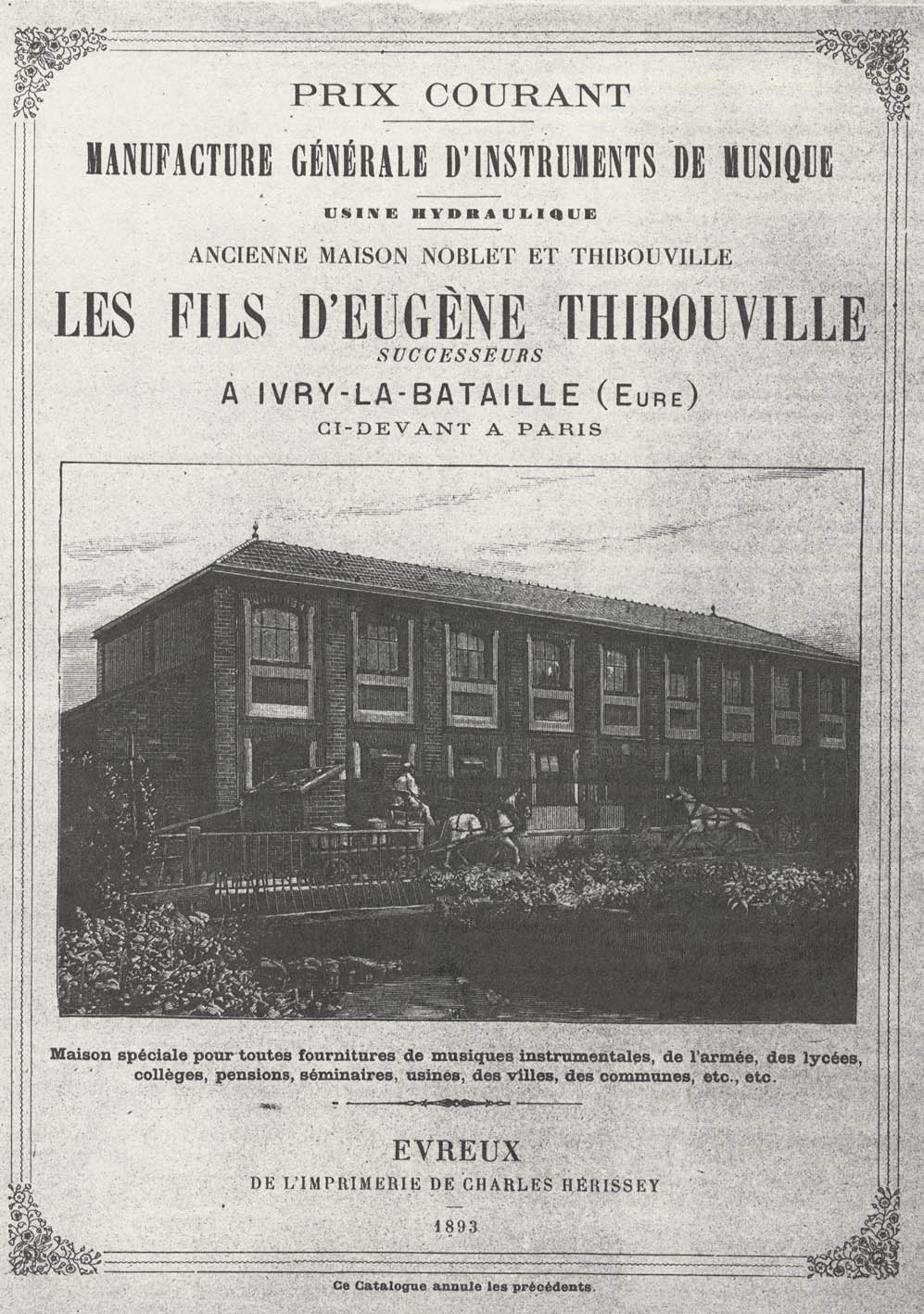 Last week, Brian Chesters asked about a mysterious book music sold by Imhof & Mukle in London. Attached there are five pages from the 1893 catalog of "fils d'Eugene Thibouville", owned by the library of our society. This catalog was issued in 1893 and lists the instruments sold by the successors of the famous Thibouville who manufactured mechanical instruments such as the Organina. But at this time, most of the firm's production was dedicated to "fanfare" with copper instruments.
