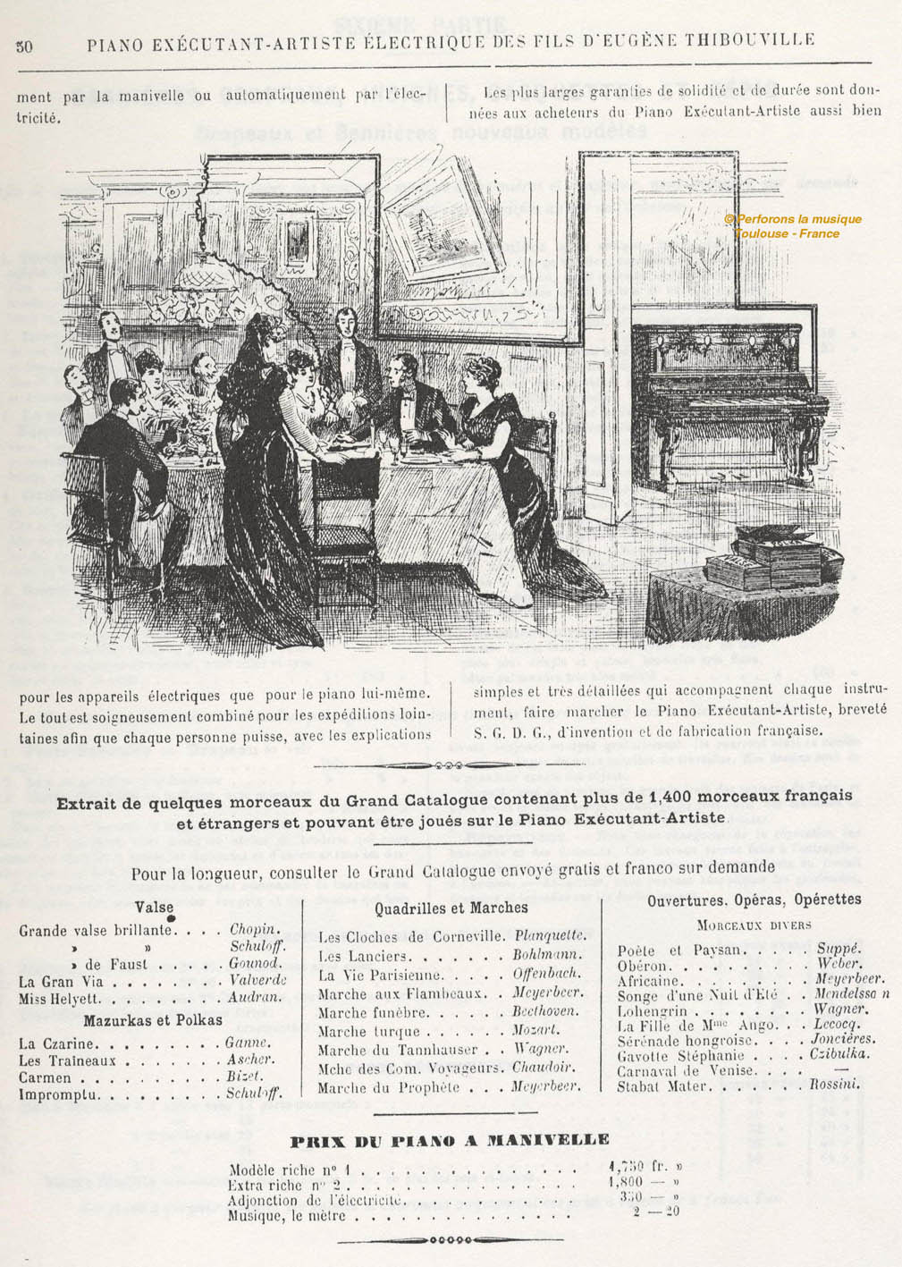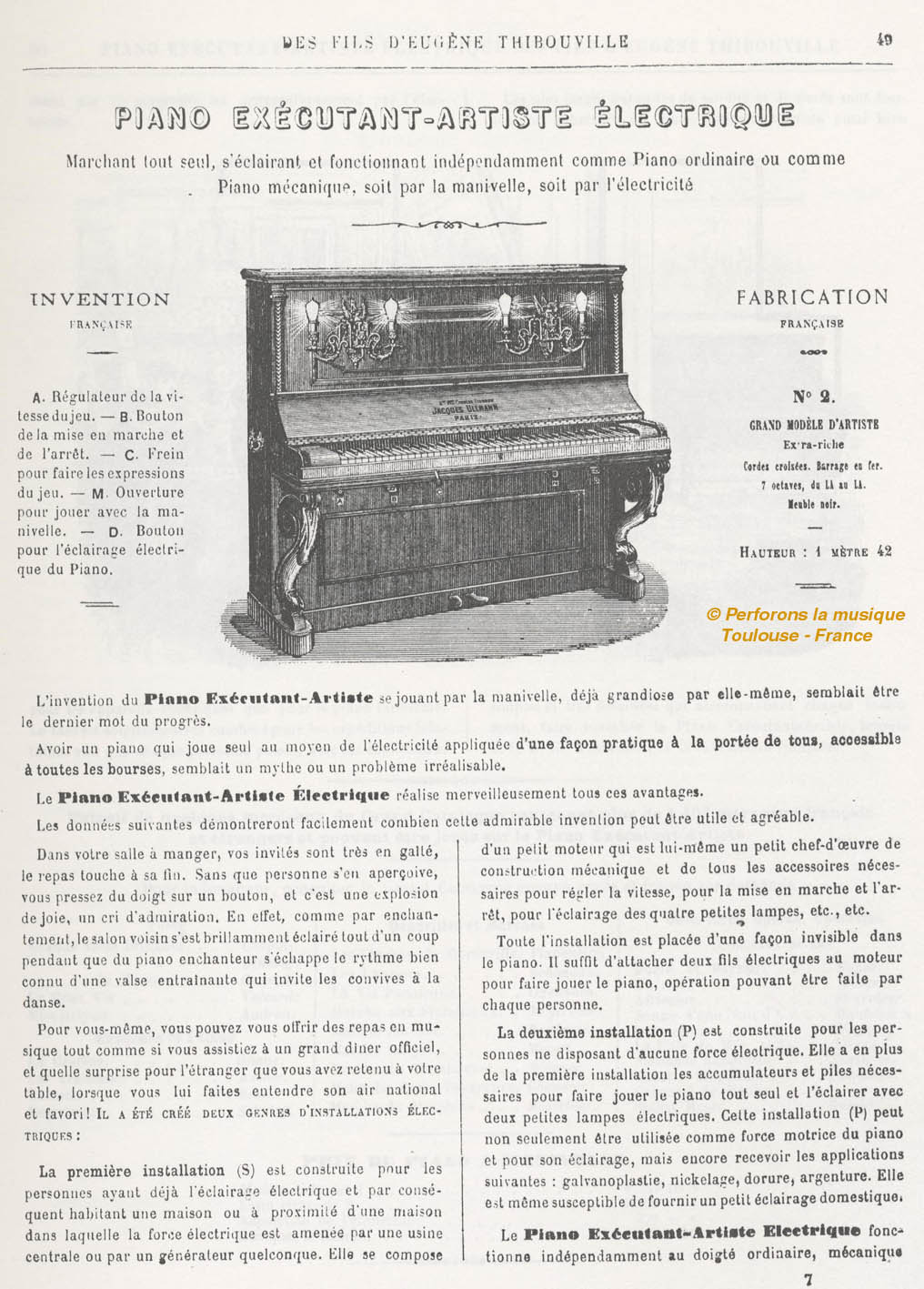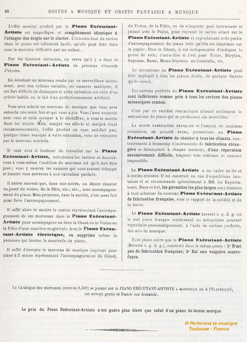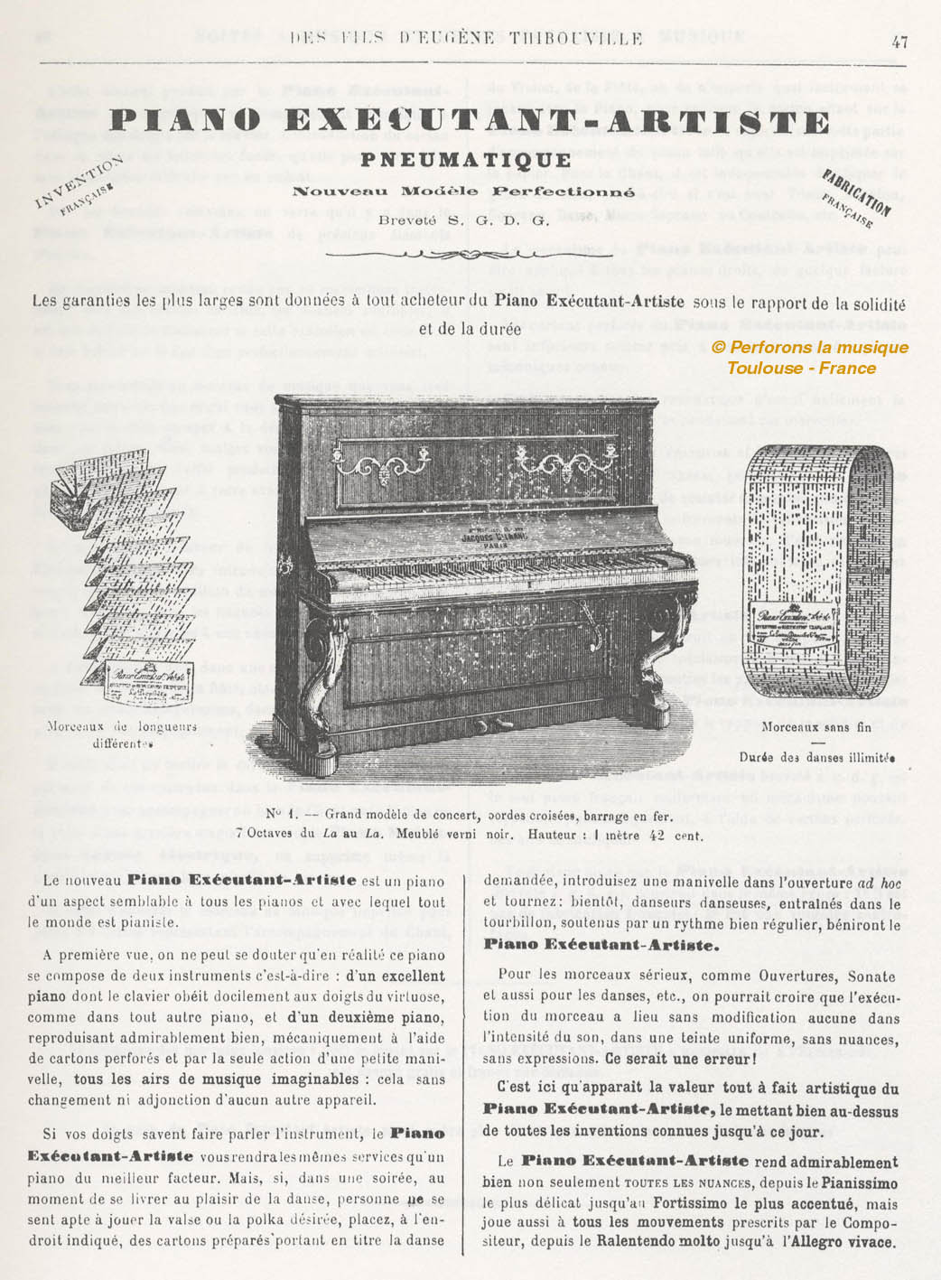 The catalog says: "The Piano Executant Artiste is the only French piano containing a mechanism that can reproduce pneumatically, with the help of punched cardboards, the musical airs."