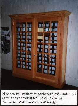 | The Wurlitzer style 165 band organ owned by Seabreeze Park since 1926 burned down with its carousel (PTC #36, built in 1926) on March 31, 1994. The fire was started about 3 p.m. by park staff re-tarring a roof, and an hour later there was nothing left but ashes. The park had a complete collection of style 165 music on more than 100 10-tune music rolls; that too was a total loss. Everything has been replaced now -- the carousel, all rolls, and band organ -- magnificently and at huge expense (well over $1,000,000, I estimate). | ![]() |