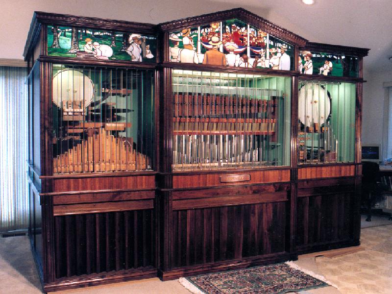 The glass was created by Brian Lewis, and is reminiscent of an 1890's "Concert in the Park" -- a pure Americana pastime. The case is made of American walnut, and the case design is primarily "Federal." The instrument has 16 live percussions and effects: 10 pipe ranks with 252 pipes, piano, xylophone, orchestra bells, mandolin effect, and expression effects, with special lighting effects. It is pre-fabricated and designed to ship and assemble on site. It has two alternating spool frames for playing O-rolls and also a MIDI controller, and is gaining a music library especially arranged for her. It also has an interactive remote box, which allows a listener to add his own live sound effects, change lighting, percussion, or switch pipe ranks as it plays. Capable of playing any combination of percussion or pipe ranks instantly, it can create large tonal color with great expression and power. It is equally at home with any type or style of music, with little or no musical compromises usually required in arrangements; its speed and repetition is due to reliable old-fashioned pneumatics and vacuum valves common to all player pianos. The orchestrion was designed to be easily accessible, easily tunable, and easily repairable. It doesn't use solid state components in its design-- only relays and magnet valves -- so it is insensitive to electrical storms and will be very repairable and reliable generations from now. Craig Brougher