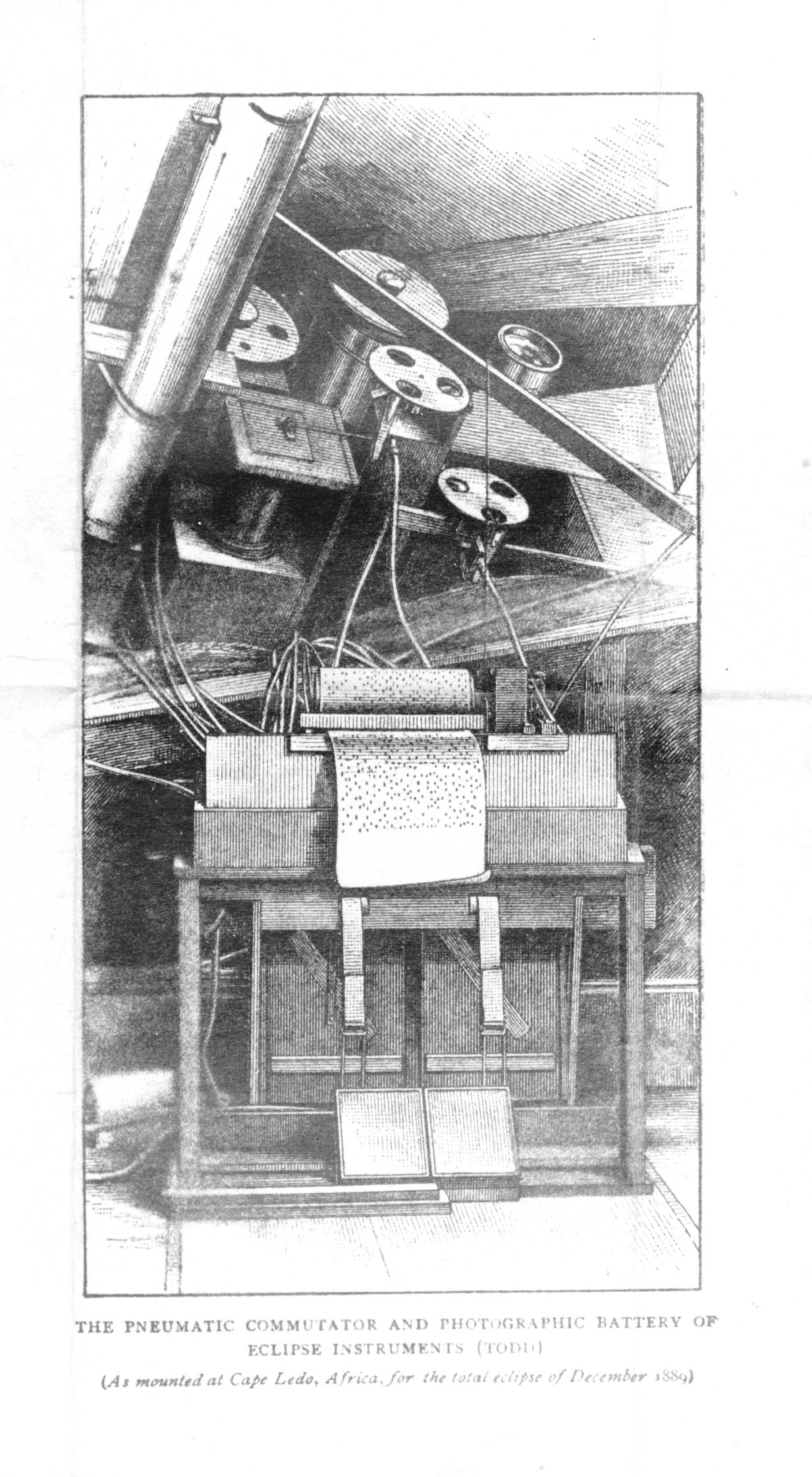 The caption says: The Pneumatic Commutator and Photographic Battery of Eclipse Instruments (Todd) (As mounted at Cape Ledo, Africa, for the total eclipse of December 1889) |