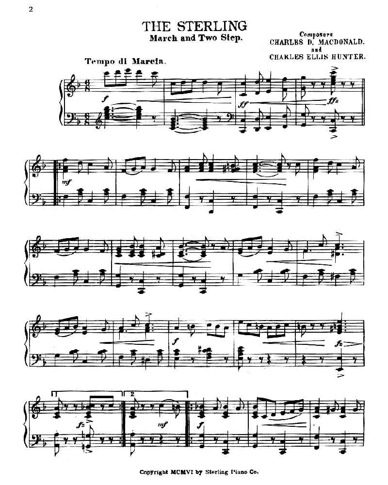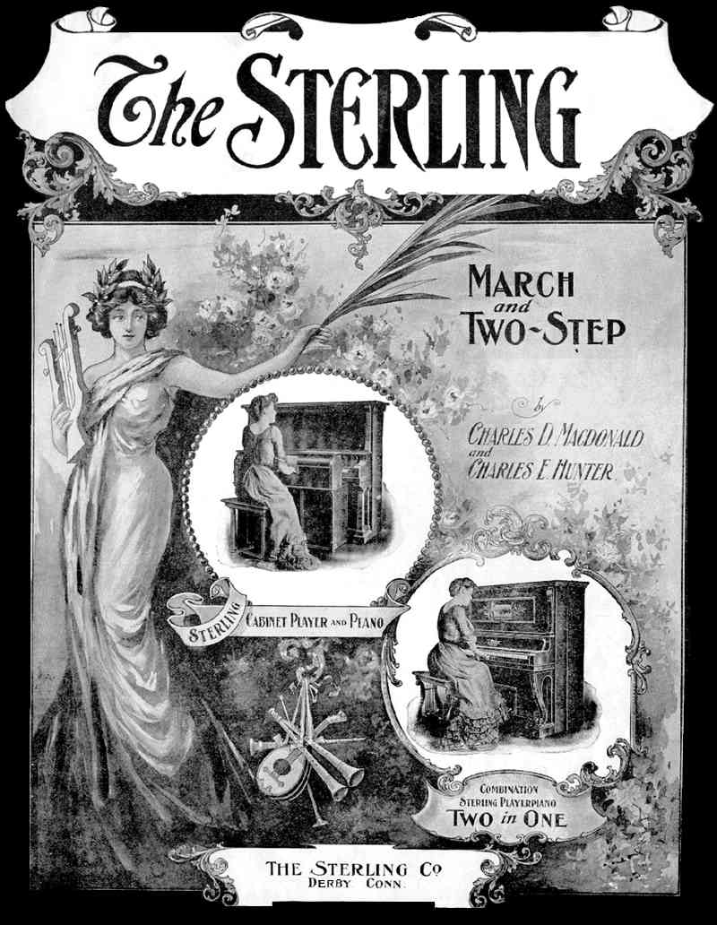 I found this sheet music at an antique store: "The Sterling - March and Two-Step", by Charles D. Macdonald and Charles Ellis Hunter, copyright 1906 by Sterling Piano Co. of Derby, Connecticut.