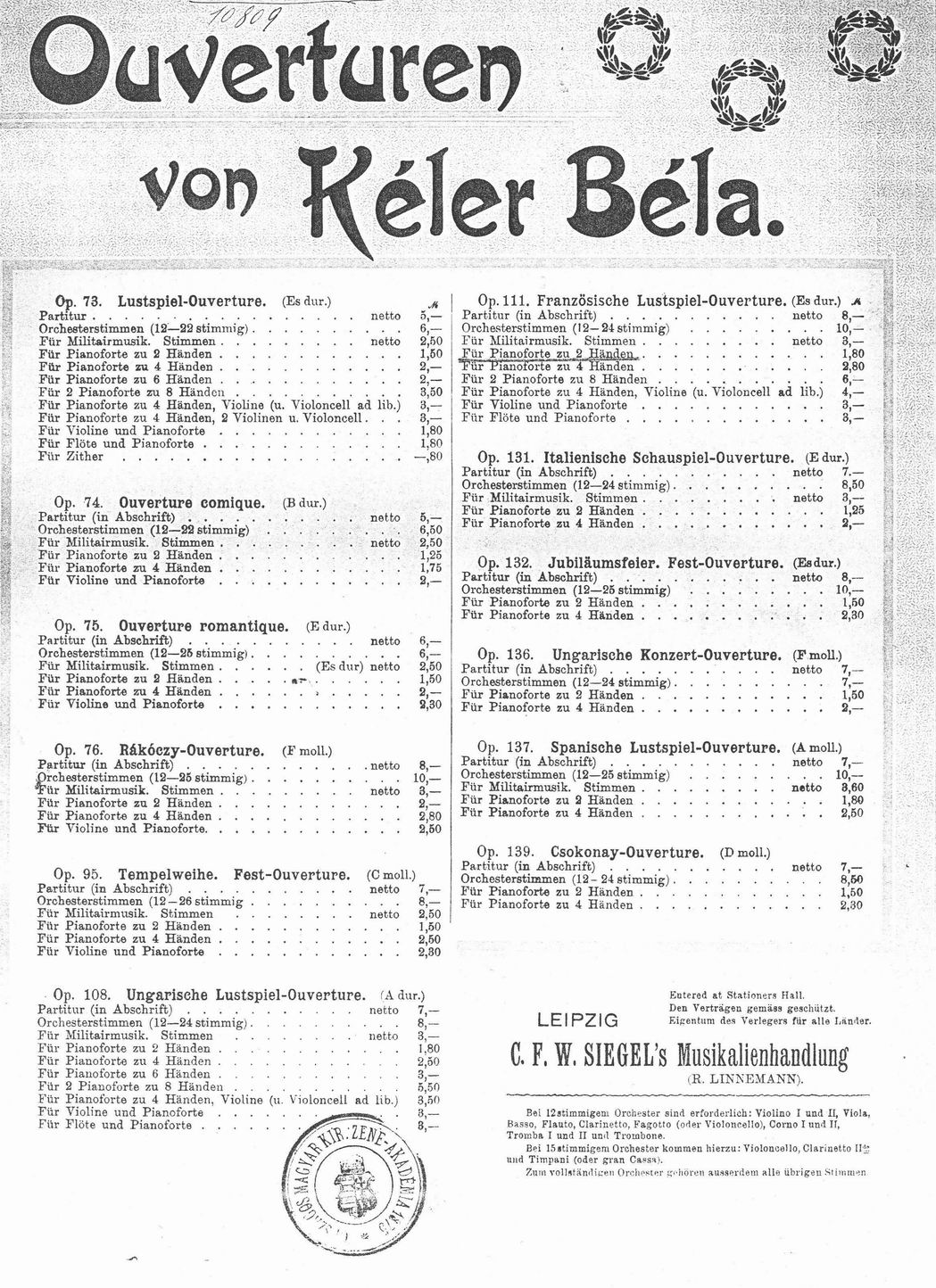 His ouverture compositions, from the original catalogue of his publisher, C.F.W. Siegel, Leipzig: