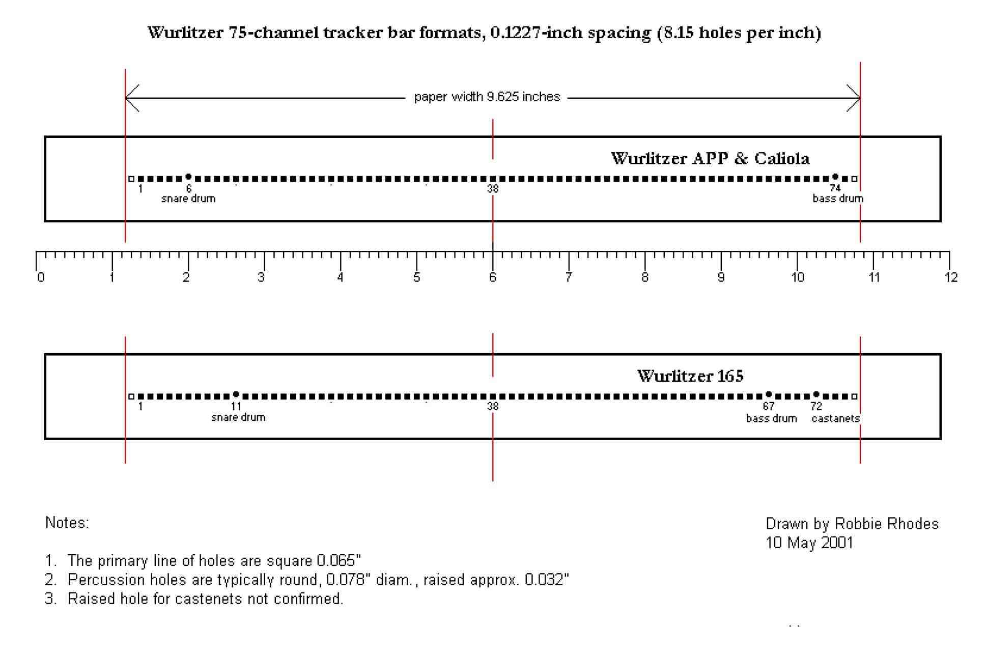 Wurlitzer APP & Caliola scale data from collectors Bill Black, Bob Fine, Fritz Gellerman, and from the book, "Treasury of Mechanical Music" by Arthur A. Reblitz. APP MIDI note remarks roll note name 1 Shut-off (coin trip) 2 ON mandolin & hammer rail 3 OFF mandolin & Hammer rail 4 ON sustaining pedal 5 OFF sustaining pedal 6 snare drum (reiterating) 7 33 A lowest note on APP piano 8 34 A# 9 35 B 10 36 C A-roll piano lowest note 11 37 C# 12 38 D 13 39 D# 14 40 E 15 41 F 16 42 F# 17 43 G 18 44 G# 19 45 A 20 46 A# 21 47 B 22 48 C (National calliope lowest note) 23 49 C# 24 50 D 25 51 D# 26 52 E 27 53 F F below Middle C - longest pipe on Caliola (pipe #1) 28 54 F# 29 55 G 30 56 G# 31 57 A 32 58 A# 33 59 B 34 60 C Middle C, MIDI note 60 35 61 C# 36 62 D 37 63 D# 38 64 E (on the center line of the paper) 39 65 F 40 66 F# 41 67 G 42 68 G# 43 69 A 44 70 A# 45 71 B 46 72 C 47 73 C# 48 74 D 49 75 D# 50 76 E 51 77 F 52 78 F# 53 79 G 54 80 G# 55 81 A Caliola lowest bell 56 82 A# 57 83 B 58 84 C 59 85 C# 60 86 D 61 87 D# 62 88 E 63 89 F 64 90 F# 65 91 G 66 92 G# 67 93 A (A-roll piano highest note) 68 94 A# 69 95 B (Tangley 43-key highest note) 70 96 C Caliola highest note, highest bell 71 97 C# APP highest note 72 ON violin 73 OFF violin 74 bass drum 75 (rewind) Note: In 1976 Noble Stidham, of Mechanical Systems, Inc., Lubbock, Texas, gave organ historian Fritz Gellerman a photocopy showing two old Wurlitzer scale sticks evidently used to arrange music for APP and Caliola music rolls. The image of the smaller scale stick, marked "Original scale for Caliola", shows the pipes connected as in the list above. The image of the larger scale stick shows complete annotation for APP, with subordinate marks showing the Caliola pipes connected to APP tracker bar holes 26 through 69, i.e., one tone flat. Possibly this is because the noteur who used the larger scale stick was arranging tunes for an instrument with pipes that were actually tuned one tone flatter than the note stamped on the pipe.