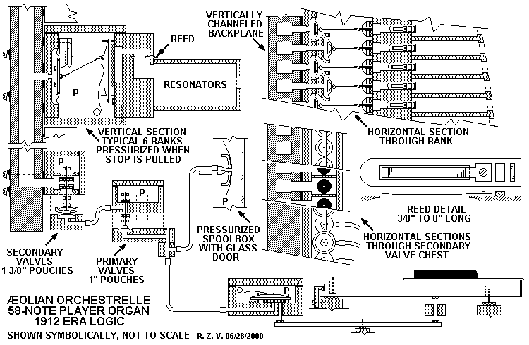 I made this diagram, shpwing the basic principles of operation, based on what I saw as I was taking down my newly acquired Orchestrelle for a complete, frame-up restoration. It is somewhat preliminary, and does not depict everything to scale, although the relative proportions of the components are reasonably accurate.