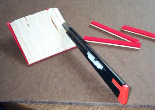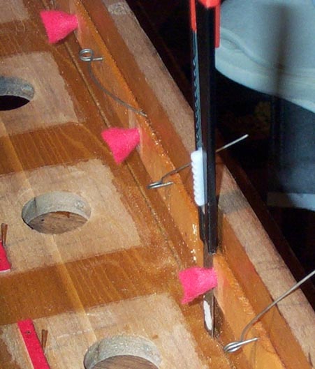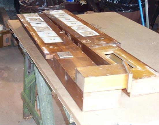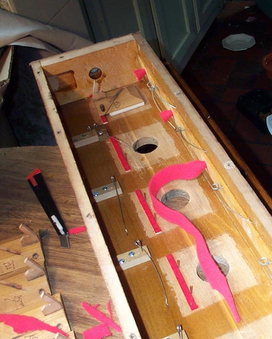 When the stop pallets are opened, their rear ends rest on little strips of felt. Throughout the organ, such strips were used, and to avoid getting glue on the pallet seating area, they were made up ahead of time, on thin wooden sticks nailed to the valve boards. The ones in the stop chests were moth eaten, and wouldn't come off without breaking the sticks. So I made new ones: cut little sticks, 1/4" x 1/16", longer than needed. Stick them to a scrap wood with the micro-carpenter's friend, double faced carpet tape. Saw the whole board to make the all sticks the correct length all at once, and drill little holes for the nails. Glue new felt to the whole thing. When dry, trim and cut them apart like pallets, and renail them inside the chest.