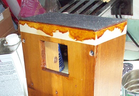 The ends of the chests were covered with bellows cloth, to seal the joints between wood running in different grain directions. replace this with hot glue; then trim the edges with a bastard file (much neater than a knife, the way it was done on player pianos). Them mask and seal the edges of the cloth with "Goopalac". Thick, dark brown shellac made by mixing equal volumes of Behlan's raw shellac flakes and alcohol in a coffee can. This stuff will be used throughout the project, just as it was used by the people who originally made players. Shellac that thick won't keep; that's why you must make it yourself.