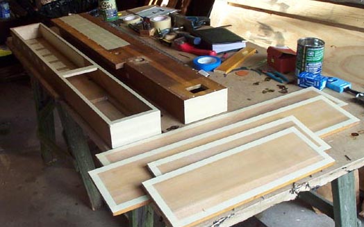 After the chests are disassembled and cleaned, mask and reshellac them. This is not done for looks, but to refresh the existing shellac which may have developed cracks over the years. Wood is porous, and shellac was used originally to seal it.
