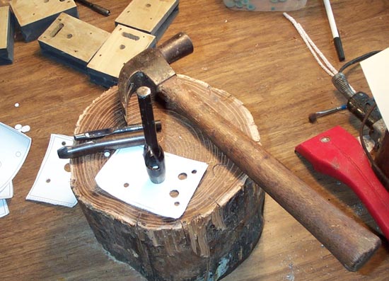 To make the pulldown gaskets, I made a template on Visio; printed it, and stuck it on the leather on the sticky board, with Spray Mount. For this gasket, I chose Leather Supply House goatskin splits, skivers from the back side of valve leather. This is just like the pouch leather skivers used by the originals for small gaskets; thin, unfinished on both sides, but very dense and elastic. It can only be used between two very flat surfaces (which I have here), but it is much better than the porous cowhide sold as "packing leather", and far cheaper too. Leaving the sticky paper in place, I punched the gasket, and glued it on. The paper keeps the very flexible leather straight and square during the gluing.