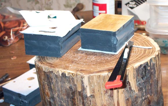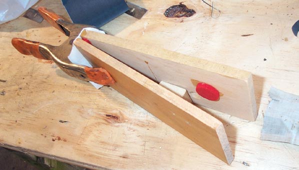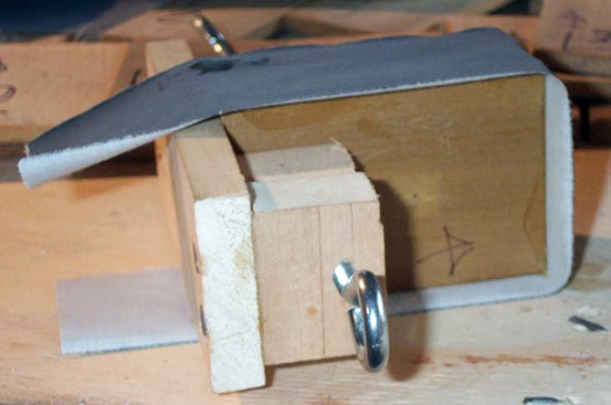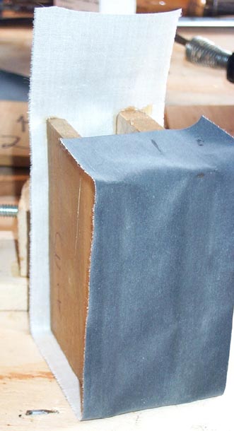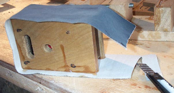 After the glue sets, peel off the paper (the gelled glue is much stronger than the tacky Spray Mount), trim the gasket. Then finish the trim of the top edge of the cloth with a fine single cut file, and shellac the outer board. This seals both the wood and the any porosity in the exposed edge of the cotton layer in the cloth.