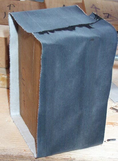 On the original cloth the rubber looked intact, but it had dimerized, and would have failed sooner or later. However, the cotton was still fairly strong, and the cloth pulled off mostly in one piece. Then it took only one stroke of a scraper to take off the high spots on the old glue layer. That is one of the beauties of hot glue; the new will merge perfectly with the old, and it is not necessary to remove most of the original glue, or cut into the wood. I have vowed to never let the belt sander touch this organ, thereby preserving the squareness and dimensions of all the old wood, for the next rebuilder in the 22nd. century. The covering proceeds in the normal manner.