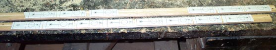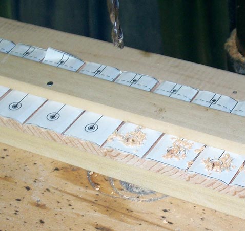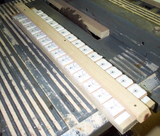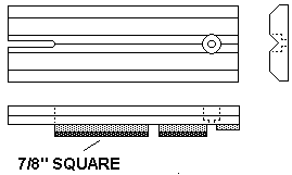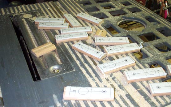 The pieces were stuck to a scrap board with double-sticky carpet tape; sawn all together to the correct length, and the ends belt-sanded smooth. Then the guide pin clearance hole, the guide hole itself, and a hole defining the inner end of the front guide pin slot were drilled