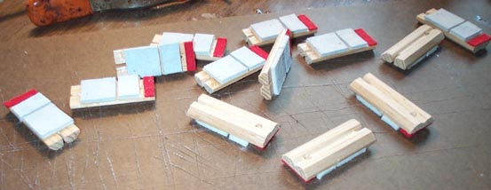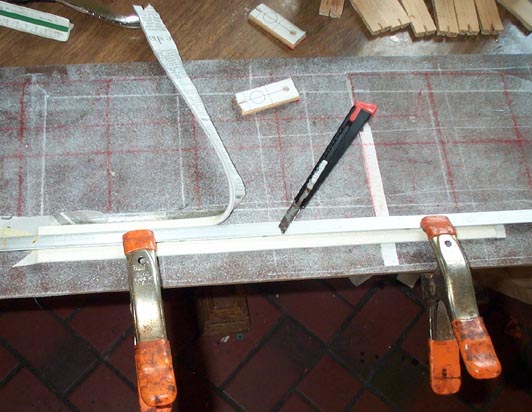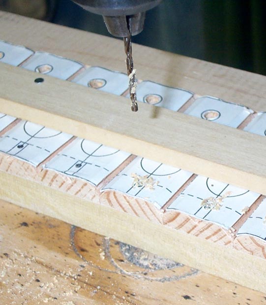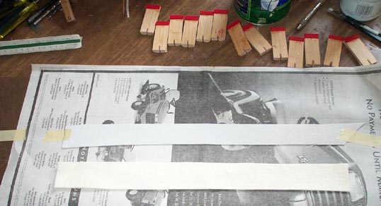 A full scale drawing of the pallet was made and tiled in Visio, and printed on adhesive backed paper. These images were pasted on the stick, and then the stick was roughly cut to length.