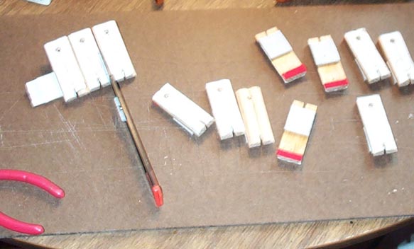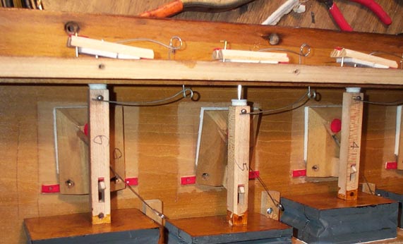 Now install them. Small brass l-hooks were used for the pallet guides, with the rear one clipped off. They have to be bent very plumb to the board, to allow easy movement of the pallet. This looks easy, but it takes a lot of precise adjustment to assure smooth action. The springs have to be bent just so, so that they press the pallet home when the stop is open, but at the same time are weak enough to be opened by the main stop action spring when the stop is closed. These pallets, unlike most of the others in the organ, close against the wind pressure, so they have to seal reliably by spring force only.