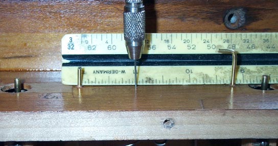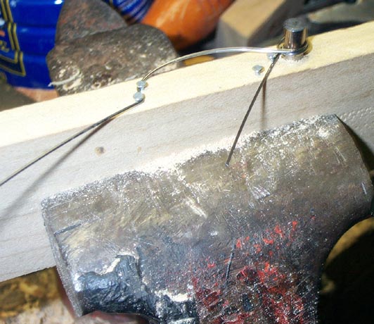 A rig to bend the new springs. I used #13 piano wire 'cause that is what I had. The old spring remnants were so rusted that I could not measure them accurately, but it looked ok. The same wire in a pin vice, with the point ground into a crude "spoon bit" will be used to drill the holes for the spring butts.