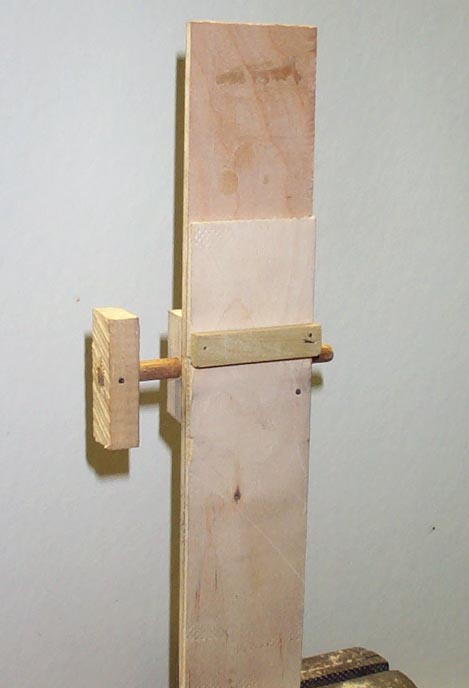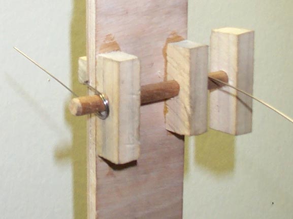 Make marks on the board 2-1/4" apart, centered on the lowest hole, to locate the fixed end laterally. Position the fixed end, and stretch the springs only about 1/8"; not much tension is needed, and it can be increased later if necessary. Mark the screw hole with an awl, and attach with a #4 x 3/4 RH screw and organ punching. Tighten the screw, with the fixed end stick crooked, then loosen it until the tension just pulls it straight.