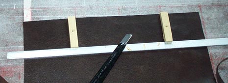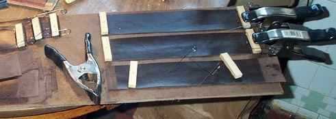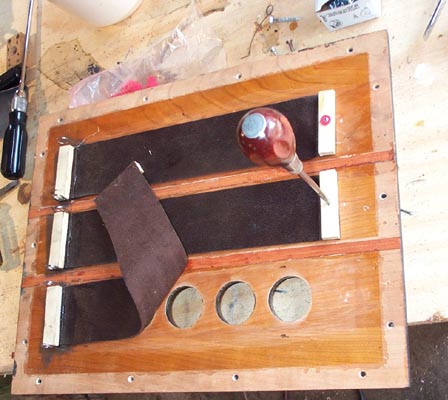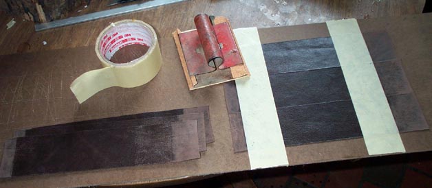 Cut the pieces from Leather Supply House thin flap valve leather, 3/4" inch longer than the six 12" x 2-1/4" and eight 9-1/2" x 2-1/4" pieces required. Remove the varnish from the areas to be glued.