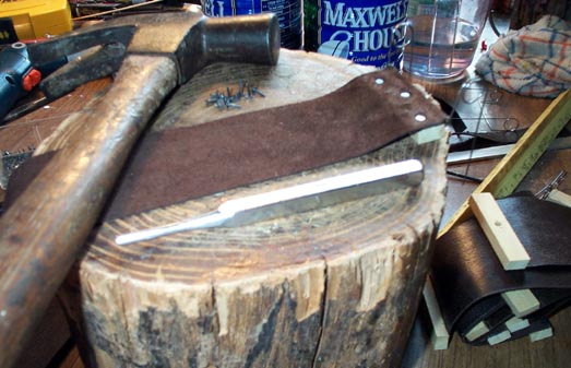 Fold and glue one end to form the hem, with the spring inside, and glue on a new wooden stick. The leather is stiff enough that the joint needs a little help to stay closed until the glue jells. The original strips were tacked to the board at the fixed end, but this is hard to do, and still keep the leather perfectly tight on both edges. Also, it would be hard to unhitch the strip later, if it were necessary to remove a bit of rubbish that might get trapped under the flap. So I followed the example of Ampico and other player makers, by attaching another stick to the fixed end, which will swivel around a screw in the middle. That way, the strip will be automatically self aligning. After the glue is well set so the stick won't shift, add tacks. Their heads must be driven well below the leather surface; this surface must slide very smoothly on the wood.