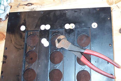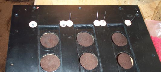 Using a wire in the pin vice as a drill, make the holes for the spring legs, if they are not already there. (Ignore the odd appearance of this feeder valve panel; I had to make all new valve seat boards because the old ones had been abused in the past. More about this in the wind supply reconstruction chapter later.) These holes are about 1/8" beyond the strip edges; 2-1/2" apart for the 2-1/4" wide strips. Insert the wires until the strip just touches the panel.