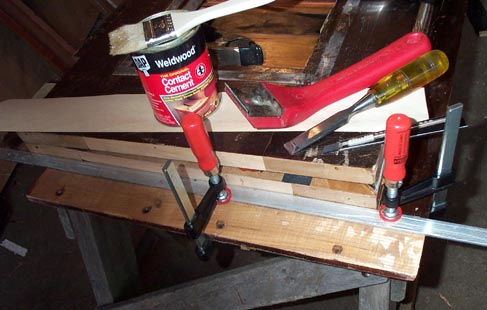 A lot of the crossbanding on the outside edges of the main board had come loose, so this was replaced with new veneer. Don't yell at me about contact cement; I am not that much of a hot glue purist. These joints don't hold air, and don't have to be undone at a future rebuild. But the new veneer is needed to produce a reasonable appearance, and to make the end dimensions of the main board nearly original, so the whole thing will fit up correctly.