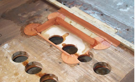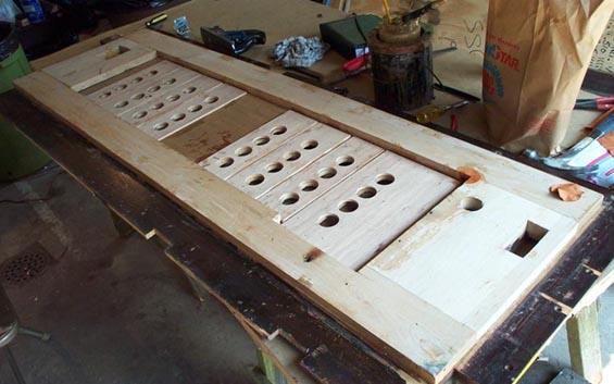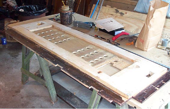 All the joints between the old and new wood were sealed with pouch leather strips or stretched circles. The maple framework, although still sound and strongly jointed, had shrunk slightly, so just in case, all the cracks were sealed with pouch leather circles of cloth strips. This is one thing in this chapter that might well be done on any Orchestrelle, even if extensive reconstruction were not needed.
