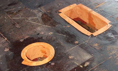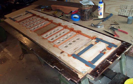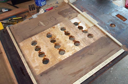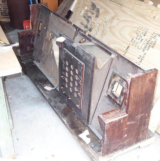 To make room for the blower duct, a big hole was cut right into the flap valve array for the removed feeder. Also, the plywood main board (oak lumber core with poplar crossbanding) had become delaminated in several places. The inner surface of this, forming the inner flap valve seating surface, was cracked and wrinkled.