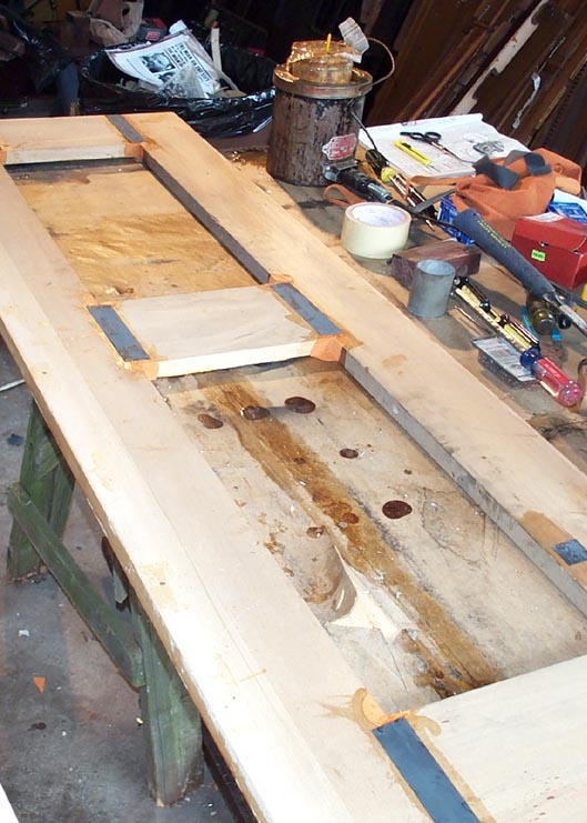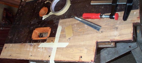 These surfaces were covered with new seat areas, made from 1/4" Finnish birch plywood with a cherry top layer. I selected cherry because it was the densest, closest grained hardwood veneer available. The duct opening in the feeder frame was enlarged with a chisel, so that the new seat board there overlapped the remaining parts of the main plywood board on all sides. On the feeder side, the duct opening in the plywood board was patched, and new gluing sticks for the feeder cloth, matching the style of the other feeder, were installed.