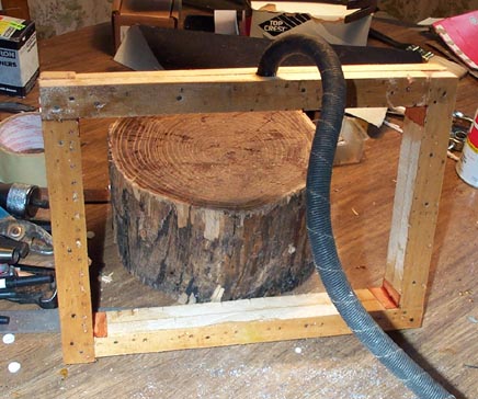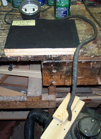 I want this restoration to be as good as possible in every respect, including as much freedom from leakage as possible. So I decided to take Craig Brougher's and D. L. Bullock's very good advice, and test the cloth for freedom from leaks. I mad a simple test chest from scrap wood (won't win any prized for neat finish, but it works). Then I covered both sides of the frame with the cloth; one side with some old material had gotten 5 years ago from Schaff, and the other with new cloth just purchased from another vendor. The rig on the discharge of the ShopVac is an adjustable vent port on the hose fitting, by means of which I can vary the pressure in the hose from 4" to 18" WC.