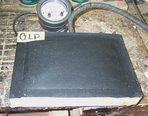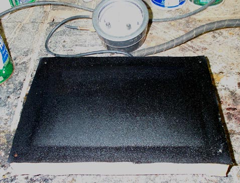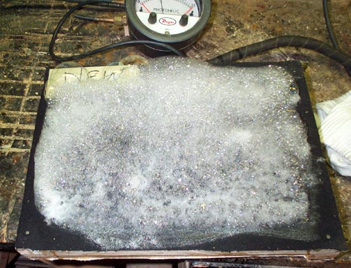 A mixture of 3/1 water and dishwashing liquid is painted on cloth while under pressure; I picked 10" WC. If the cloth is porous, the wetted area will stay white from a thin layer of microscopic foam formed on the surface. Discrete pinholes will show up by blowing bubbles. First I tried the side with the old cloth, with the good results shown. When the liquid is first brushed on, white streaks of foam appear due to the act of brushing. But after a minute or two, if there is no porosity, this disappears, leaving the cloth black but very wet.