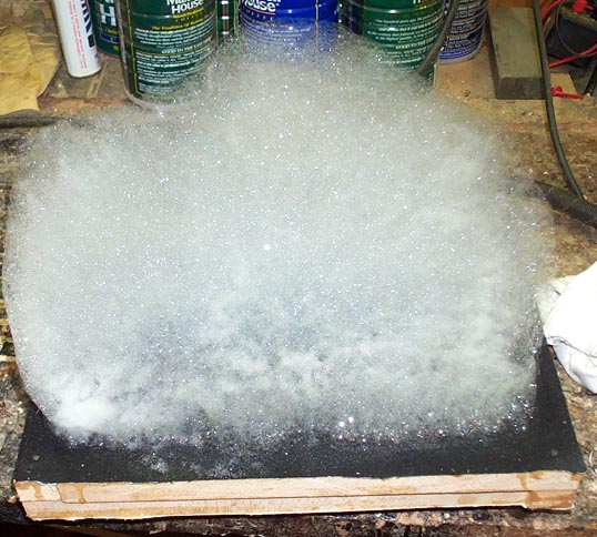 Then after five minutes. After that long, the mass of foam didn't increase very much, since by then the original bubbles started popping (I could watch this happen) as fast as new ones formed.