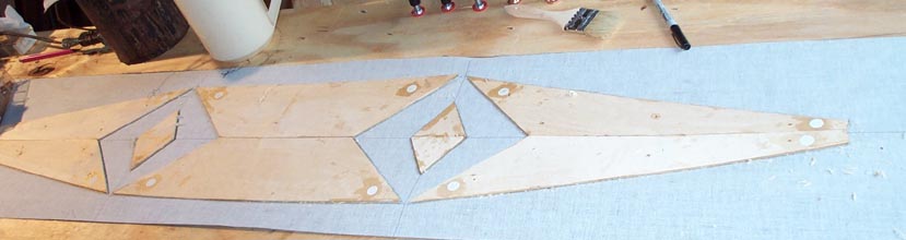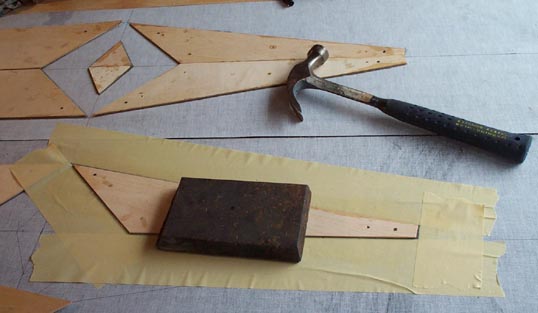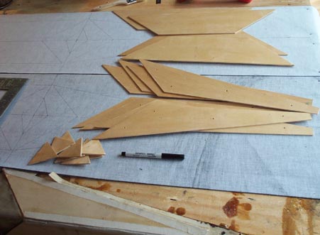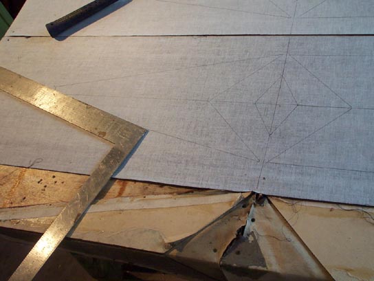 First make the gussets. The originals were 1/8" binder's board (gray cardboard), but my usual source, slit open PVC binders, weren't big enough, so I used 1/8" Finnish plywood. An old gusset, nailed on a stack of rough cut blanks, enabled me to make them all at once on the table saw. The cloth is stretched and tacked to the table, and a line dividing the cloth lengthwise is drawn; this must be very straight, the whole length of the cloth. (A similar line was still visible on the old cloth.) Trace the gusset positions along the line, using the old cloth as a guide,