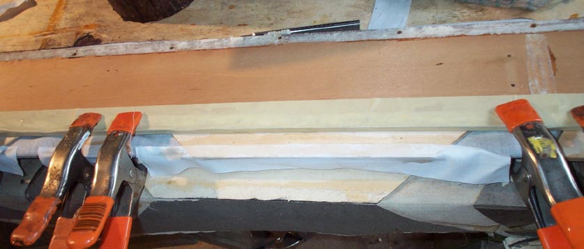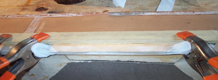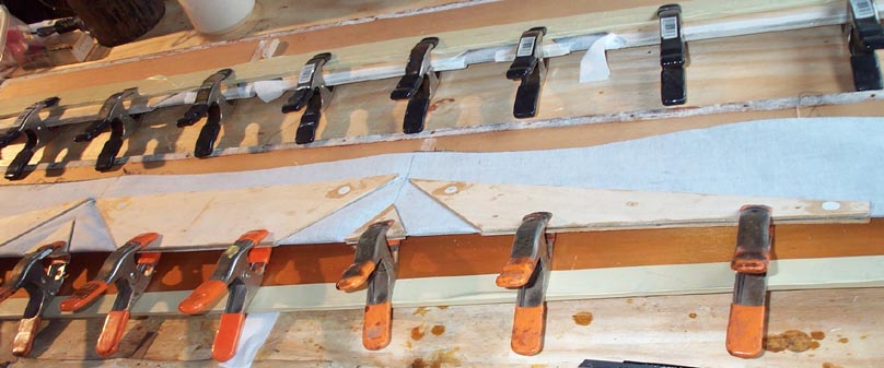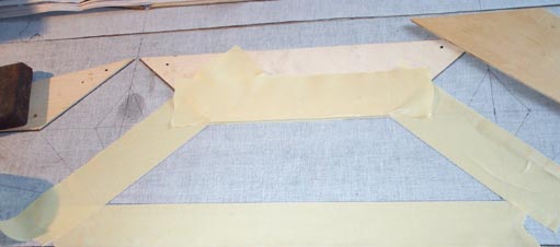 Glue the gussets to the cloth. Mask and apply glue to the cloth and the gusset, to assure a firm, complete bond. An old reservoir weight holds one piece in place while another area is made ready. Tiny tacks at the corners defeat the tendency for the gusset to warp up at the ends. When masking for the matching lower piece, lap the tape over the inner edge to minimize getting glue on the gusset edge, them quickly pull of this tape. The edges of the matching gusset pieces must touch along the center line.
